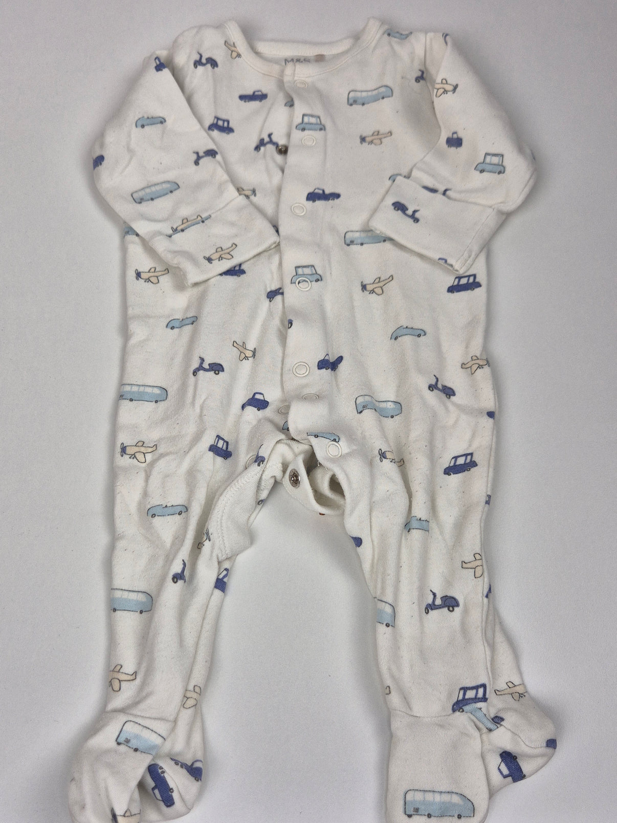 Roztomilé dupačky Marks&Spencer v bílé barvě s celoplošným potiskem autíček, letadýlek a skútrů v modrých a béžových odstínech. Zapínání na patentky po celé délce usnadňuje oblékání i přebalování. Integrované ťapky chrání nožičky před chladem a měkký bavlněný materiál se postará o pohodlí při každodenním nošení i spánku. Vhodné pro chlapečky.