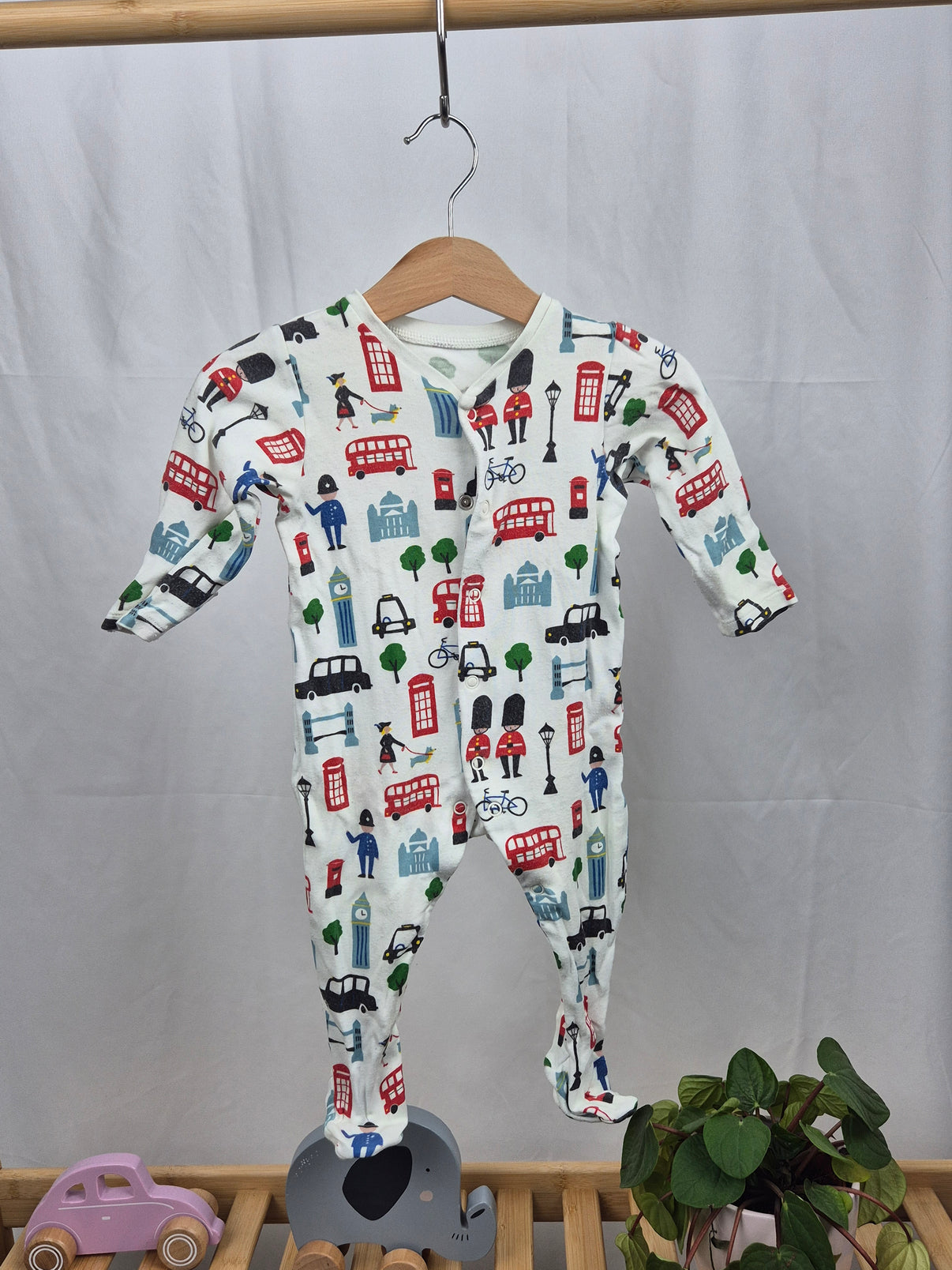 Stylové dupačky od značky Marks & Spencer ve velikosti 68 s veselým potiskem inspirovaným Londýnem. Krémový základ oživený motivy červených autobusů, telefonních budek, stromů a ikonických památek přináší originální a hravý design. Vyrobeny z měkkého a prodyšného materiálu, který je šetrný k citlivé pokožce miminka. Praktické zapínání usnadňuje oblékání i přebalování. Perfektní volba pro pohodlné a stylové dny i noci vašeho děťátka!