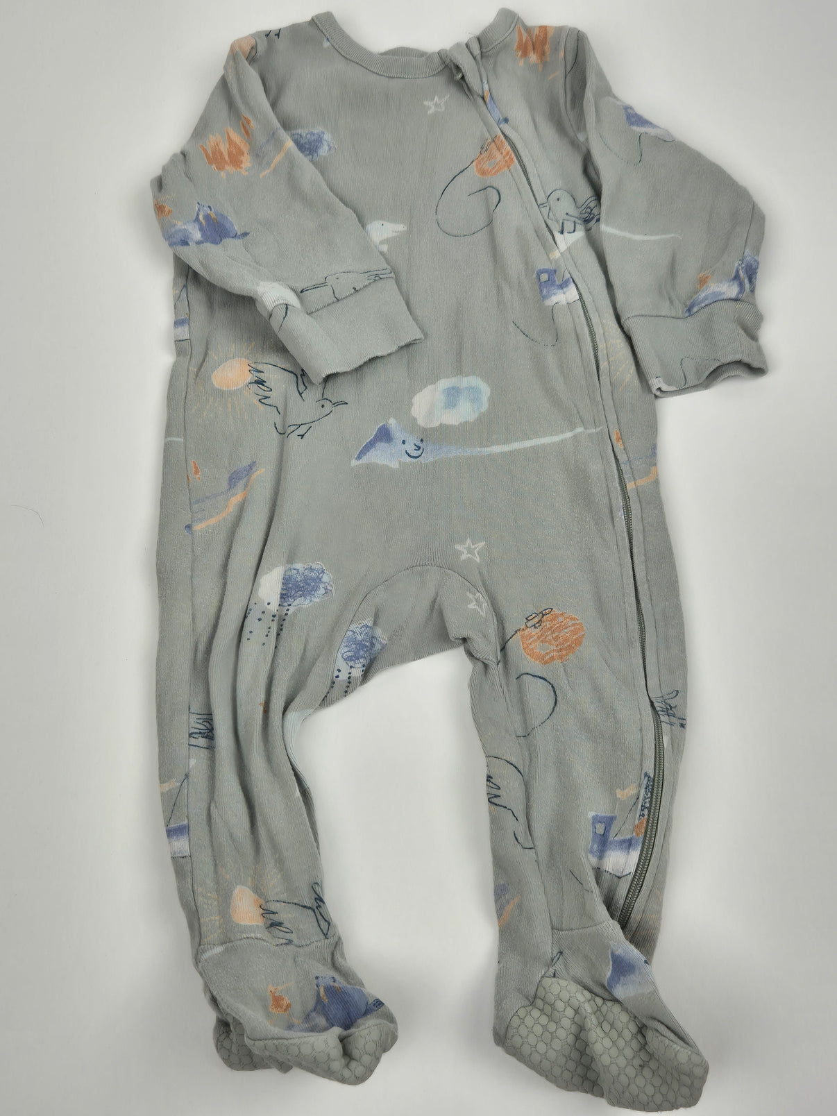 Jemné kojenecké dupačky značky Marks & Spencer ve velikosti 76 zaujmou jemně šedou barvou s decentním potiskem zvířátek a motivů oblohy v pastelových tónech. Díky praktickému zipu po celé délce se snadno oblékají a přebalují, zatímco protiskluzové ťapky zajišťují bezpečí při prvních krůčcích.