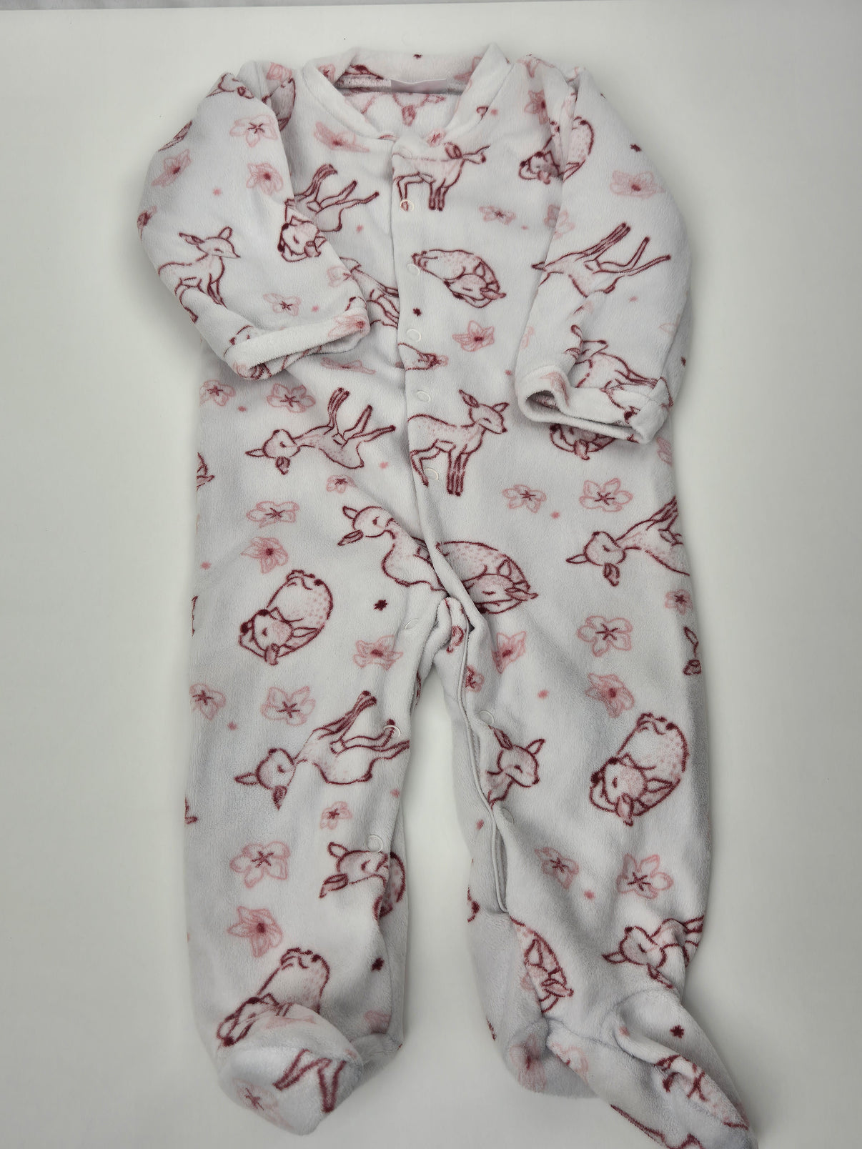 Hřejivé dupačky značky Pepco z hebkého fleecového materiálu jsou jako stvořené pro chladnější dny a klidné spaní. Bílý podklad s roztomilým vzorem lesních zvířátek a květinek v růžových tónech potěší...