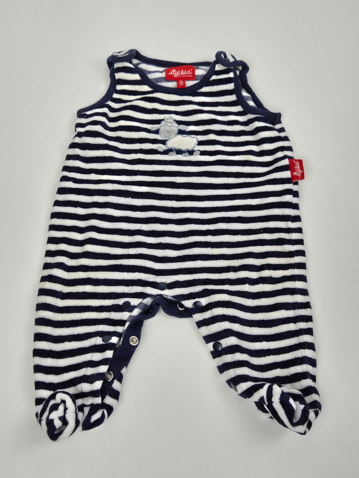 Roztomilé dupačky od značky Sigikid ve velikosti 56 jsou ideální pro nejmenší miminka. Námořnický vzhled s tmavě modro-bílými pruhy doplňuje jemná aplikace ovečky na přední straně, která působí hravě a roztomile. Praktické patentky mezi nožičkami i na ramínkách usnadňují oblékání a přebalování. Měkký a hebký materiál zajistí pohodlí a teplo, takže se miminko bude cítit příjemně po celý den. Skvělý unisex kousek vhodný jak pro holčičky, tak pro chlapečky