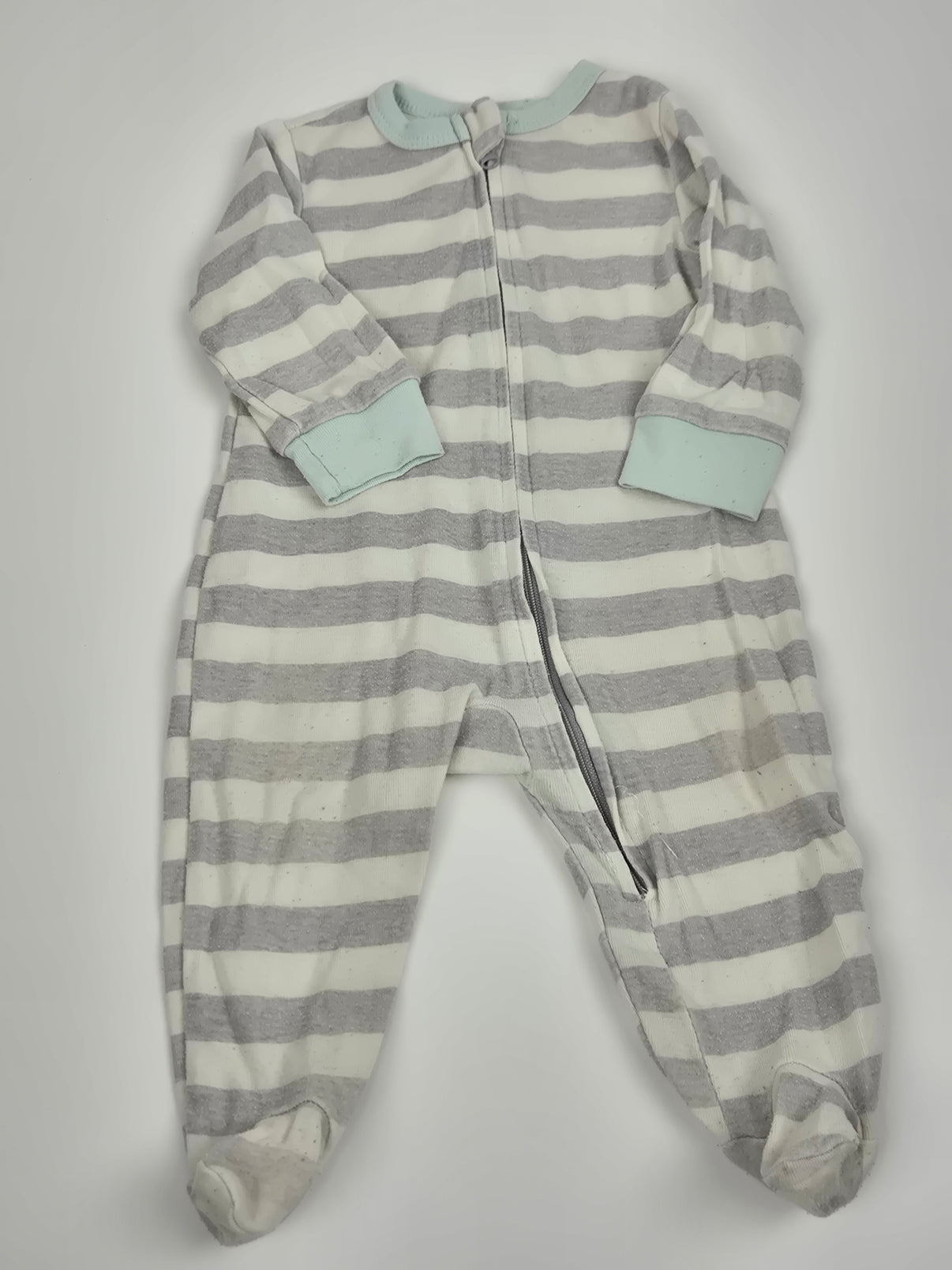 Pohodlné kojenecké dupačky značky Tahari ve velikosti 62/68 v jemném proužkovaném designu v šedobílé kombinaci. Světle mintové lemy dodávají jemný barevný akcent. Praktické zapínání na zip usnadňuje přebalování i oblékání. Měkký materiál zajišťuje maximální komfort pro miminko při spánku i denním nošení.