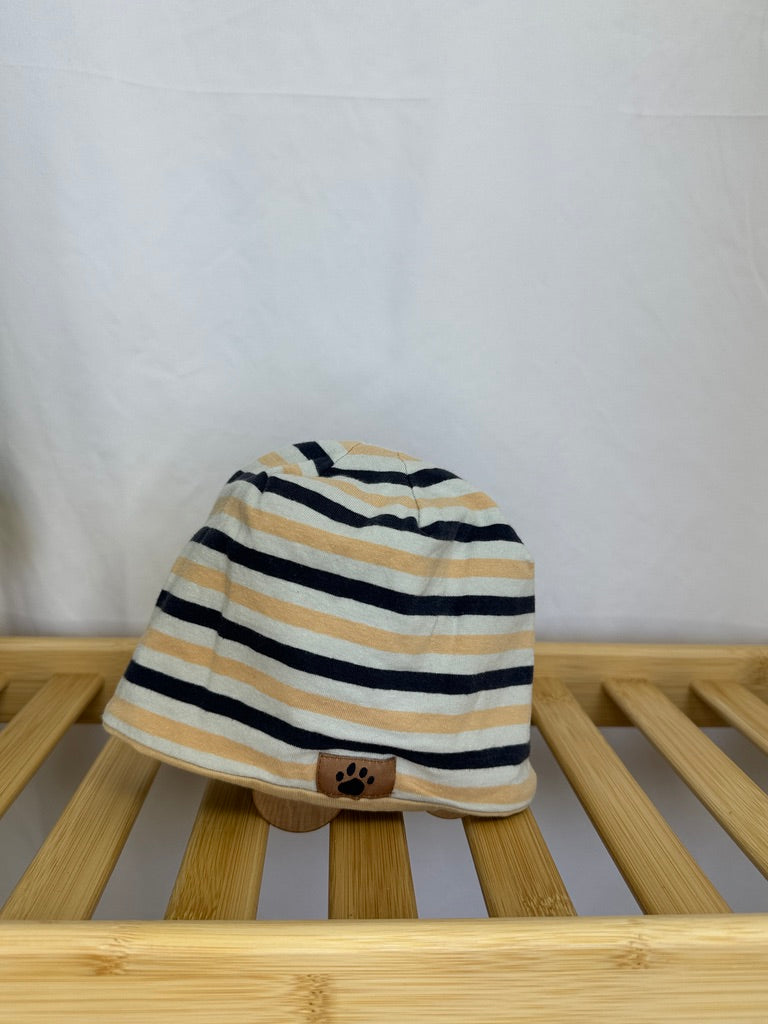 Pruhovaná čepice ve velikosti 74/80 je stylovým a praktickým doplňkem pro malé děti. Čepice je vyrobena z měkkého materiálu, který zajišťuje pohodlí při nošení. Design tvoří jemné pruhy v béžové, černé a bílé barvě, které dodávají moderní vzhled. Na přední straně je malá nášivka s motivem tlapky. Čepice je ideální pro chladnější dny.