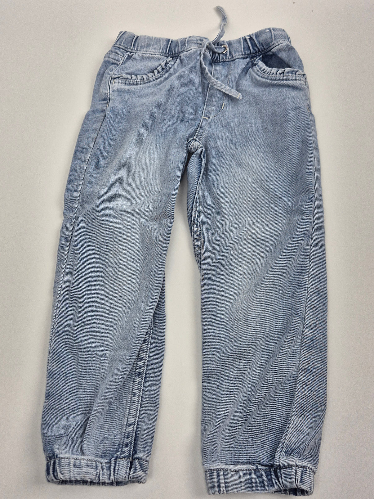 Stylové dívčí džegíny H&M ve velikosti 98 kombinují vzhled klasických džínů s pohodlím legín. Světle modrý denimový materiál je měkký a příjemný na dotek, pas na gumu se stahovací šňůrkou zajistí perfektní padnutí. Spodní lem je zakončen do gumy, takže dobře drží u nožky. Skvělé pro každodenní nošení do školky i na výlety – pohodlné, univerzální a snadno kombinovatelné s jakýmkoli outfitem.