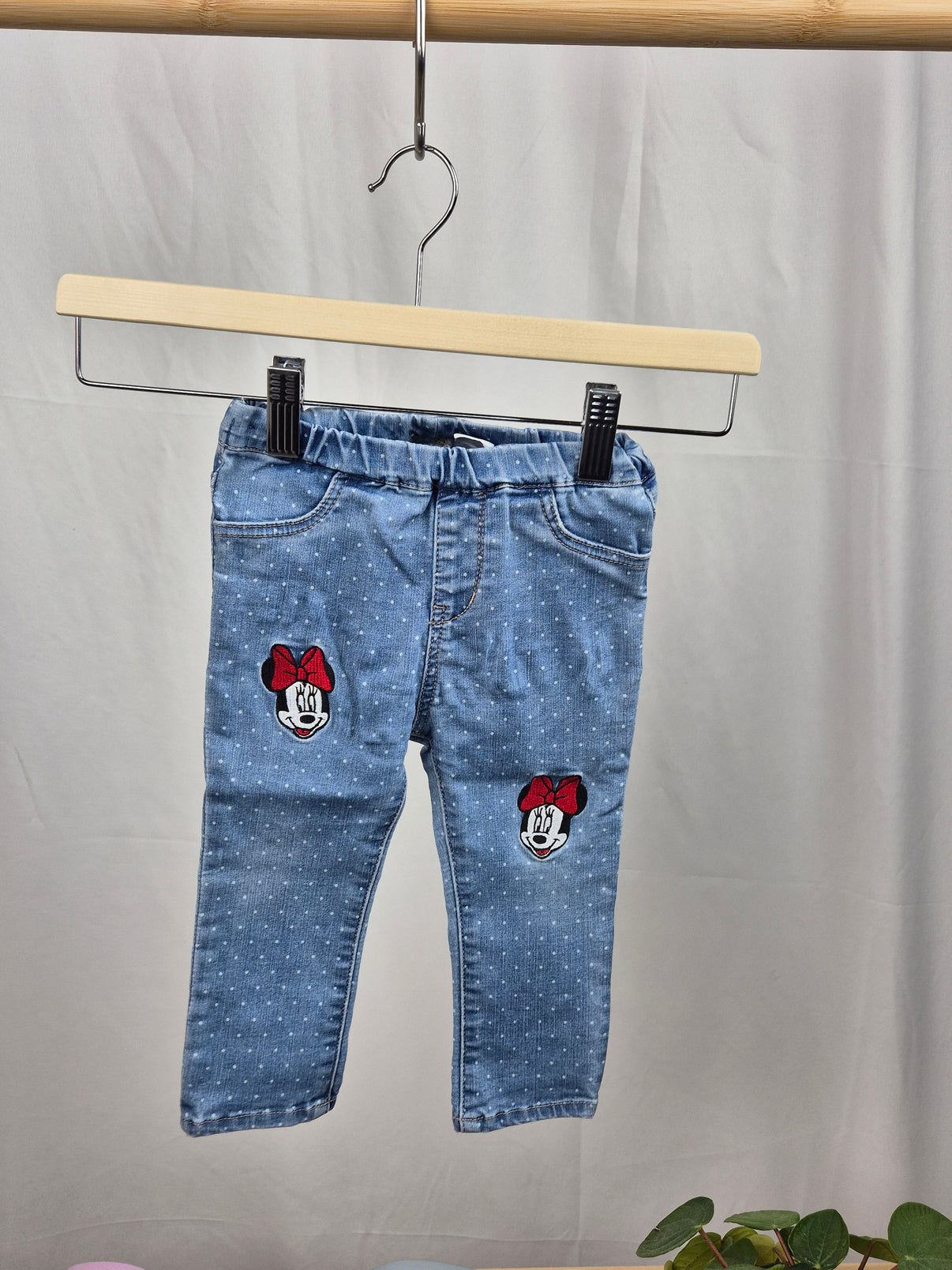 Roztomilé džegíny Minnie Mouse od značky H&M ve velikosti 80. Džínový vzhled s jemným puntíkovaným vzorem doplňují hravé výšivky Minnie s červenou mašlí na kolenou. Pohodlný elastický pas zajistí snadné oblékání a komfort při nošení. Skvělý kousek pro malé slečny na každodenní nošení do školky, na hřiště i na procházky. Stylová volba pro všechny malé fanynky Minnie Mouse.
