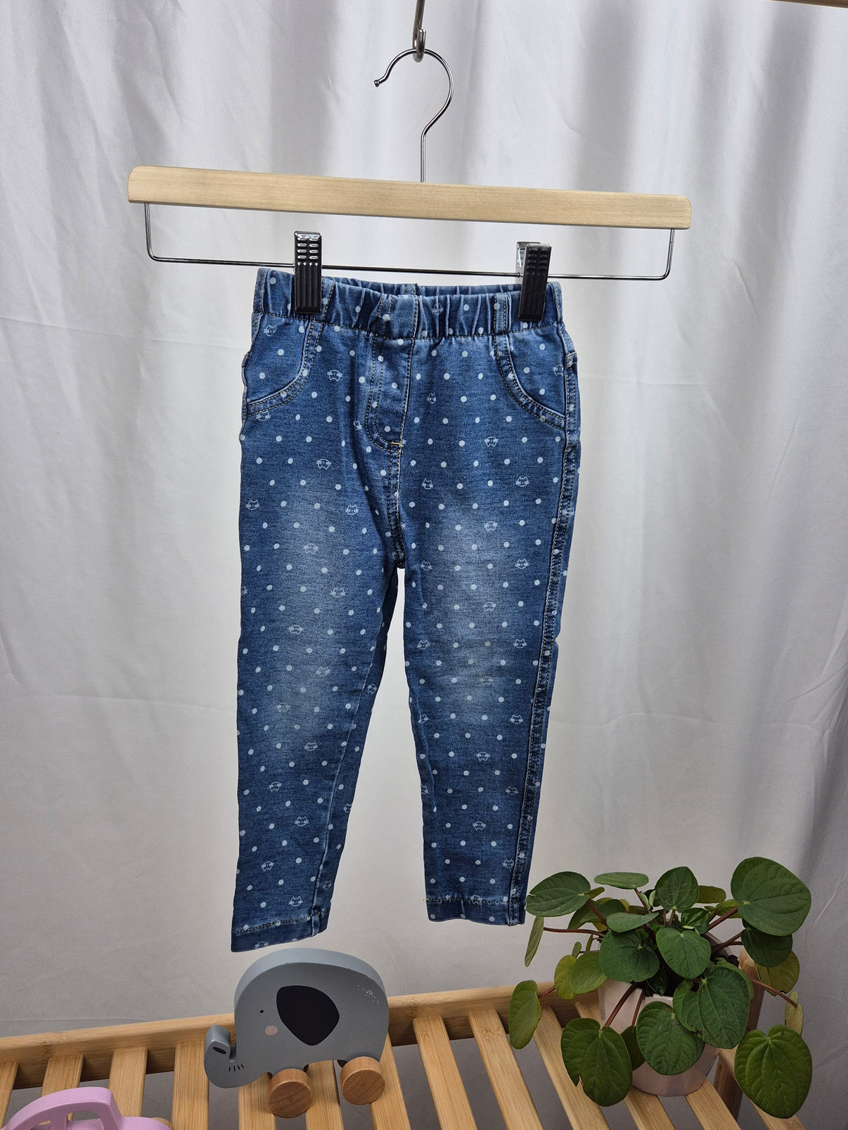 Stylové džegíny Next ve velikosti 92 kombinují pohodlí legín s trendy vzhledem džínů. 👖✨ Modrý denimový design s jemným opotřebeným efektem je doplněn bílými puntíky a drobnými motivy kytiček, což dodává legínám roztomilý vzhled. Elastický pas zajistí pohodlné nošení po celý den. Skvělý kousek do šatníku malé slečny! 💙👧