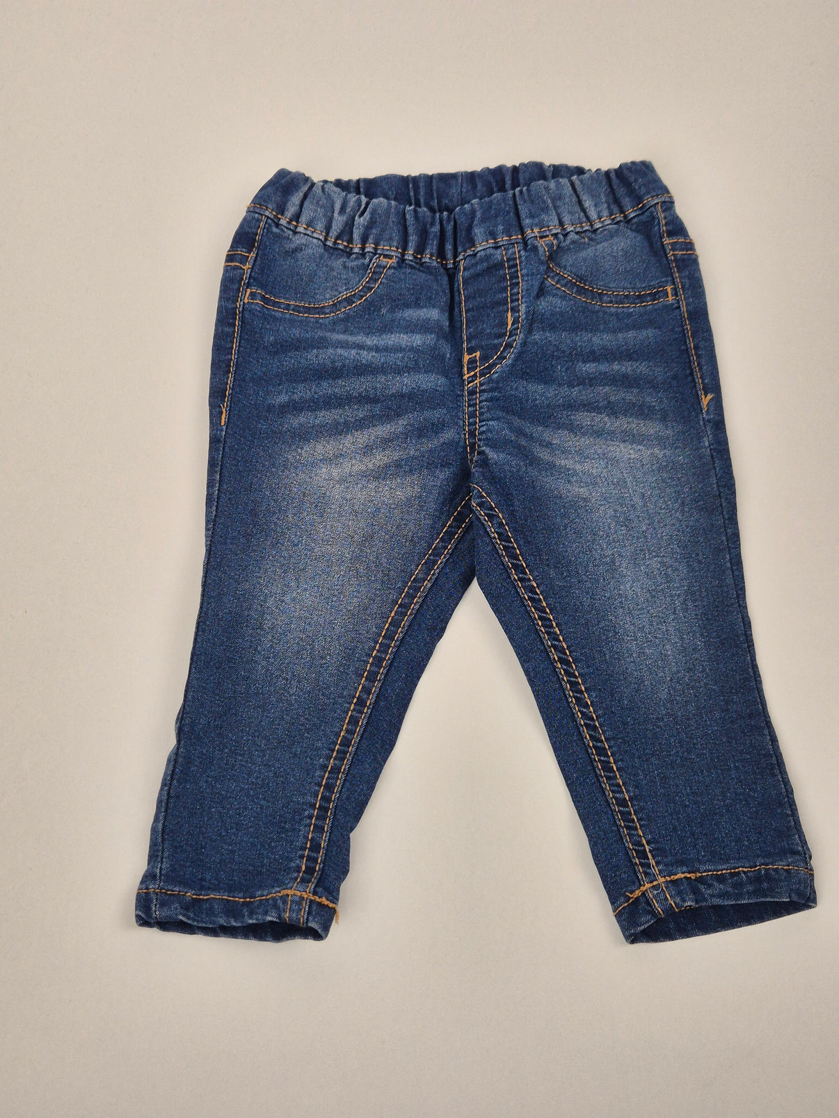 Pohodlné a stylové dětské džegíny značky Sinsay ve velikosti 68 v klasickém denimovém odstínu s jemným opraným efektem. Díky elastickému pasu se snadno oblékají a příjemně sedí, což ocení každé miminko i rodič. Oranžové kontrastní prošití a kapsy na přední i zadní straně dodávají kalhotám vzhled opravdových džínů. Skvělý univerzální kousek pro malé kluky, vhodný na běžné nošení i návštěvy.