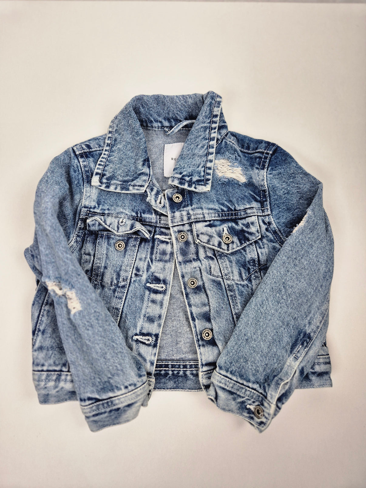 Stylová dětská džínová bunda od značky Reserved v klasickém modrém denimu s lehce obnošeným efektem a jemnými trhlinkami pro moderní vzhled. Má zapínání na kovové knoflíky, dvě náprsní kapsy s klopami a dlouhé rukávy s manžetami. Univerzální kousek vhodný pro holčičky i chlapečky, ideální na jaro a podzim.