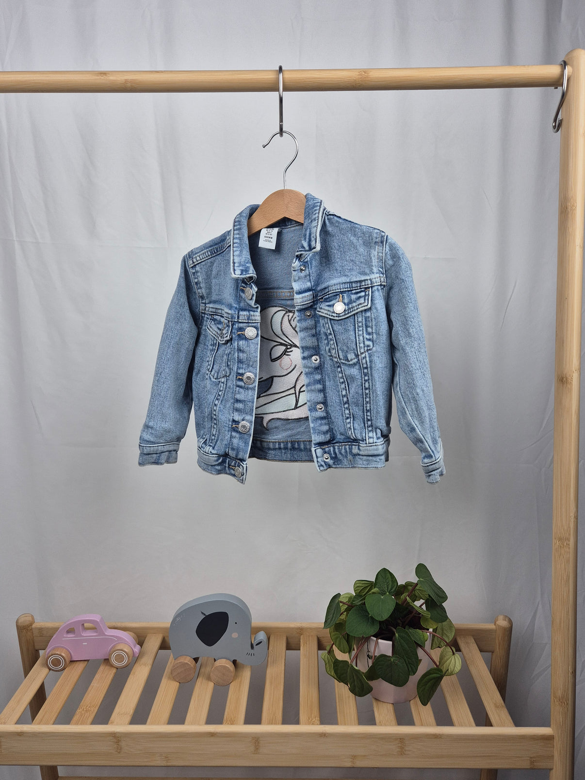 Stylová dívčí džínová bunda značky H&M ve velikosti 104, která se hodí na každodenní nošení i speciální příležitosti. Světle modrý denim s klasickým střihem je doplněn půvabnou výšivkou jednorožce na zádech, která dodává bundě kouzelný nádech. Zapínání na knoflíky a dvě malé kapsy na hrudi přidávají praktický i designový prvek. Ideální volba na jaro či podzim, která zaručí pohodlí a styl každé malé parádnici. Perfektní k sukni, šatům i legínám!