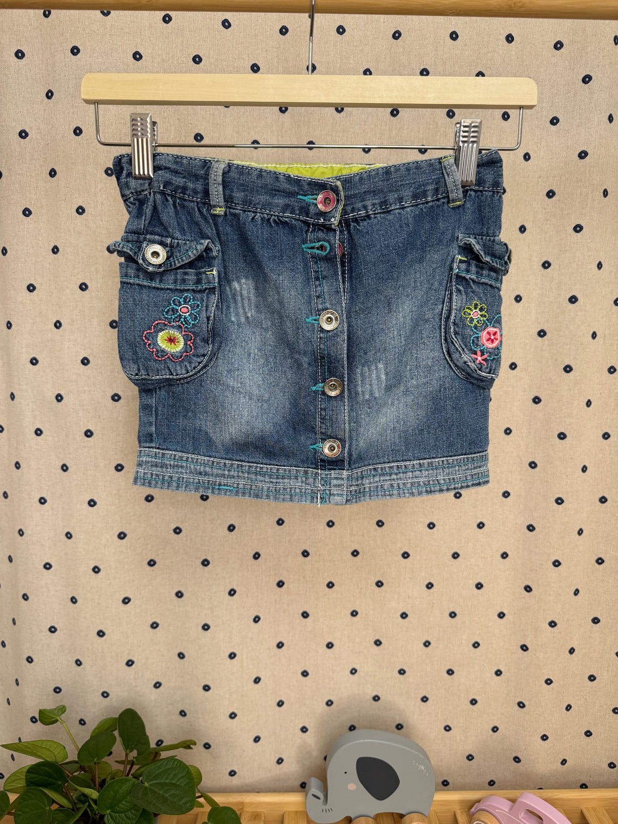 Džínová sukně značky Cherokee ve velikosti 110 je ideální volbou pro malé slečny. Sukně má zapínání na knoflíky a dvě praktické kapsy zdobené roztomilou výšivkou květin. Sukně je v klasickém džínovém stylu, který je pohodlný a hodí se na každodenní nošení.