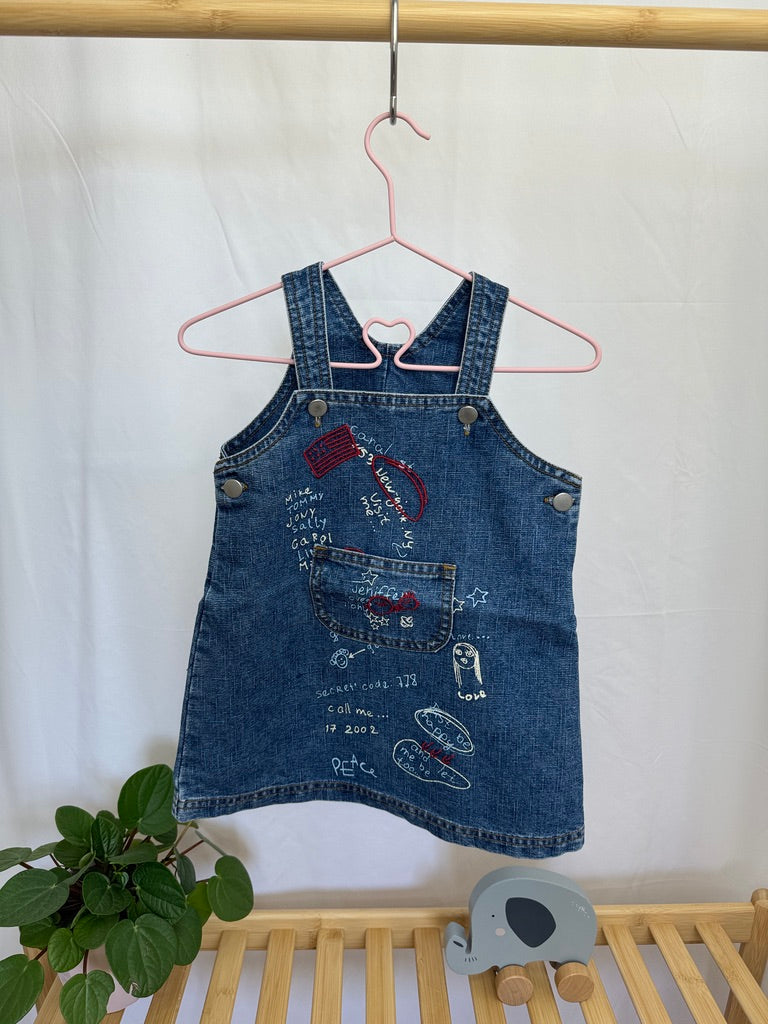 Džínová sukně s laclem ve velikosti 80 je ideální pro malé parádnice. Sukně je ozdobena barevnými výšivkami a nápisy, které dodávají kousku hravý a stylový vzhled. Praktické knoflíčky na laclu...