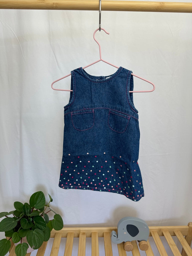 Roztomilé džínové šaty bez rukávů značky J.F.B. ve velikosti 74. Šaty jsou ozdobeny jemnými barevnými puntíky na spodním lemu, což jim dodává hravý vzhled. Praktické zapínání na knoflíky vzadu usnadňuje oblékání. Ideální volba pro malé princezny na každodenní nošení.