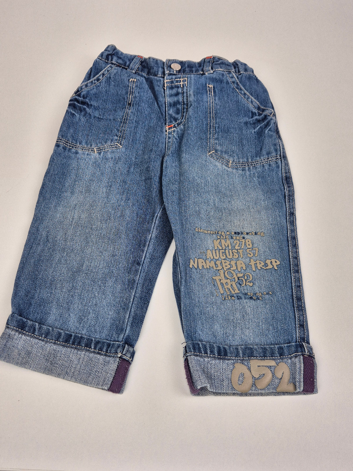 tylové džíny C&A ve velikosti 80 – ideální pro malé kluky, kteří milují pohodlí i cool vzhled. Kalhoty mají klasický džínový střih, pružný pas pro snadné oblékání a nápaditý potisk s textem Namibia Trip na jedné nohavici. Ohrnuté nohavice dodávají outfitu ležérní vzhled, takže se hodí jak na běžné nošení, tak i na výlety či do školky.