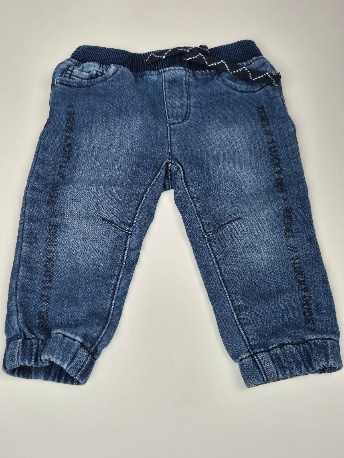 Pohodlné dětské džíny značky Coccodrillo v klasickém modrém odstínu s pružným pasem na gumu a ozdobnou šňůrkou. Měkký denimový materiál se příjemně nosí a neomezuje pohyb, což ocení malí dobrodruzi při hře i běhání venku. Na nohavicích decentní potisk dodává kalhotám moderní vzhled.