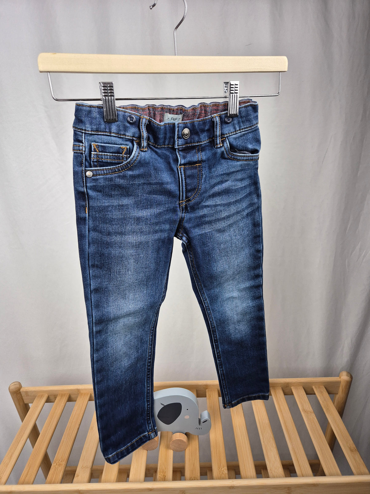 Stylové džíny značky F&F v klasickém modrém denimu s mírným opraným efektem patří mezi univerzální kousky do dětského šatníku. Díky elastickému pasu se dobře přizpůsobí postavě a pohodlně se nosí po celý den. Nechybí ani funkční kapsy vpředu i vzadu a poutka na pásek.