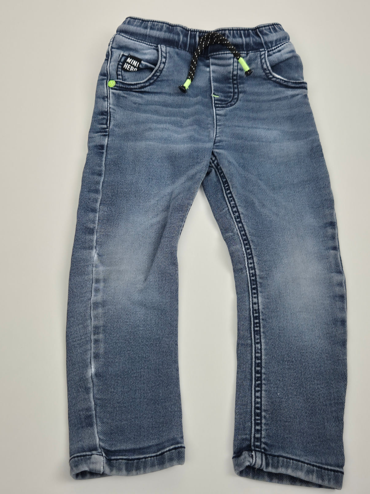 Stylové chlapecké džíny značky F&F ve velikosti 92 kombinují pohodlí tepláků s vzhledem klasických riflí. Měkký a pružný materiál v denimu s jemným opraným efektem doplňuje elastický pas se šňůrkou a výraznými neonově zelenými detaily. Zadní kapsy s barevným prošitím a nápis "Mini Hero" na přední straně dodávají džínám hravý vzhled. Ideální volba na každý den – do školky, na hřiště i na výlety.