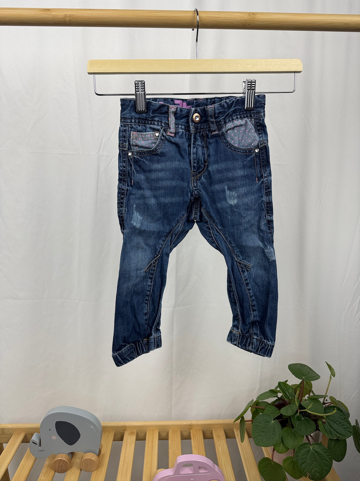 Džíny KappAhl velikosti 86 jsou ideální volbou pro malé průzkumníky. Tento model nabízí moderní střih s elastickými lemy na kotnících, což zajišťuje pohodlí a volnost pohybu. Modrý denim s jemnými...