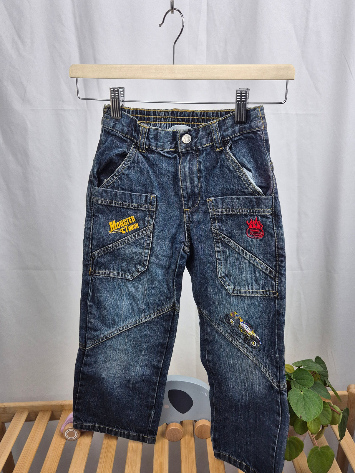 Džíny Kiki & Koko ve velikosti 110 jsou perfektní volbou pro malé dobrodruhy. Mají tmavě modrý denimový vzhled s moderním vyšisováním a výrazným prošitím. Praktické kapsy na bocích a nohavicích dodávají kalhotám sportovní styl, zatímco výšivky s motivem monster trucku zaujmou každého malého fanouška aut. Díky elastickému pasu jsou pohodlné na nošení a skvěle se hodí na každodenní dobrodružství.