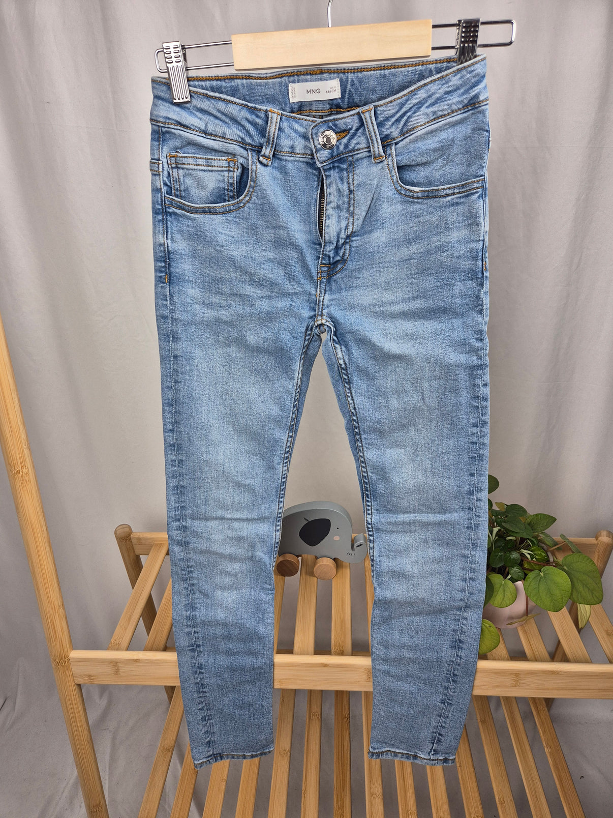 Klasické dívčí džíny značky Mango v světle modrém denimu s lehce opraným efektem. Úzký střih krásně sedí a hodí se ke každému outfitu – skvěle doplní tričko, svetr i elegantnější halenku. Praktické kapsy a poutka na pásek nechybí, zapínání na zip a knoflík je samozřejmostí. Skvělý kousek do školy, na výlety i volný čas. Pohodlné, stylové a snadno kombinovatelné – ideální do dívčího šatníku.
