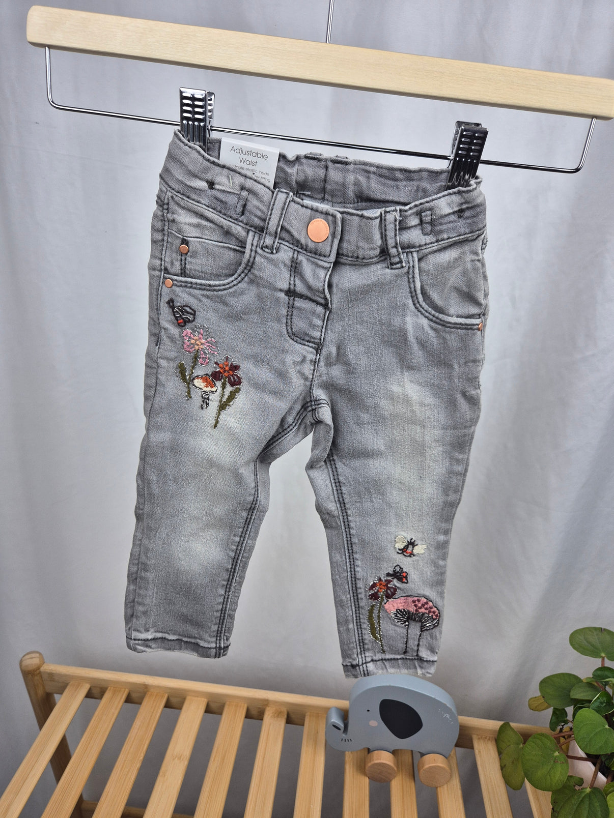 Stylové šedé džíny značky Next ve velikosti 80 zaujmou krásnými vyšívanými detaily květin, motýlků a berušek. Měkký a pružný denim zajistí pohodlí při každodenním nošení, zatímco nastavitelný pas se přizpůsobí drobnému bříšku. Praktické kapsy a poutka na pásek doplňují celkový vzhled. Skvělá volba pro malé holčičky, které chtějí být elegantní i při hrách na hřišti. Kombinace roztomilosti a praktičnosti v jednom kousku.