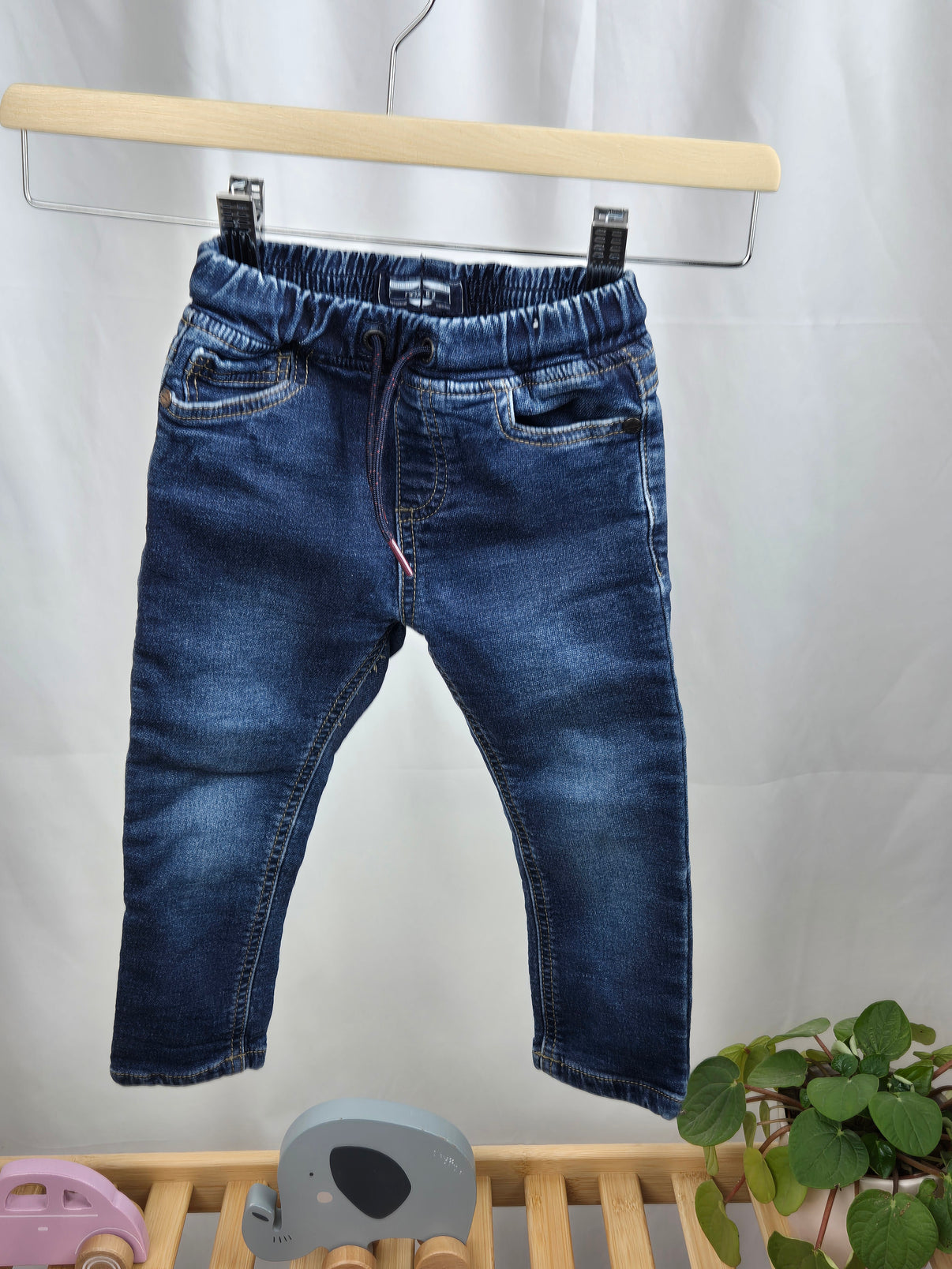 Pohodlné a stylové džíny značky Next ve velikosti 92, vhodné pro holčičky i chlapečky. Tmavě modrý denim s lehkým vyšisováním působí moderně a zároveň se skvěle kombinuje s jakýmkoli tričkem či mikinou. Kalhoty mají měkký pružný pas na gumu se šňůrkou, což zajišťuje snadné oblékání i komfort při nošení. Díky příjemnému materiálu s podílem elastanu neomezují v pohybu, a tak jsou ideální do školky, na hřiště i na výlet. Skvělý univerzální kousek do dětského šatníku.
