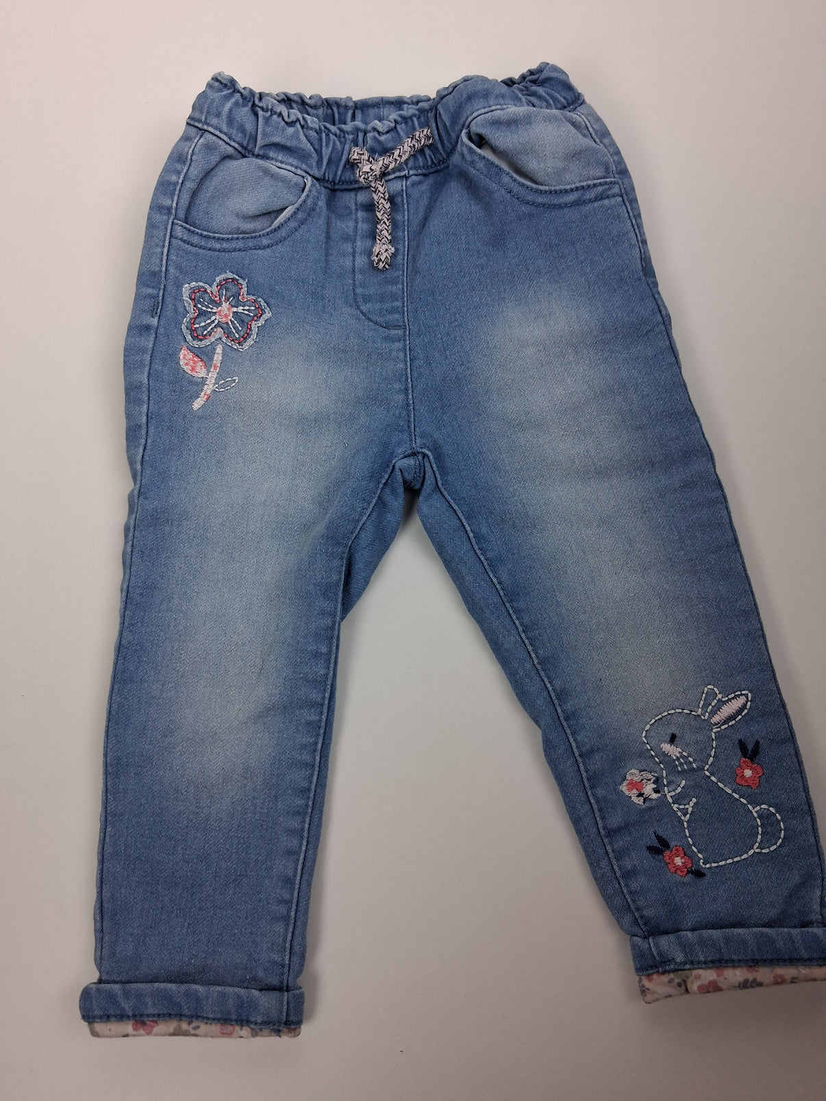 Pohodlné džíny Pepco ve velikosti 80 jsou skvělou volbou pro malé holčičky na každý den. Světle modrý denim je doplněn o vyšívané detaily – květinu na jedné nohavici a roztomilého zajíčka s kytičkami na druhé, což kalhotám dodává hravý vzhled. Měkký pas do gumy s ozdobnou tkaničkou zajistí pohodlí při nošení, a jemná květovaná podšívka, která vykukuje při ohrnutí nohavic, je krásným detailem navíc. Ideální do školky, na procházku i na výlet.