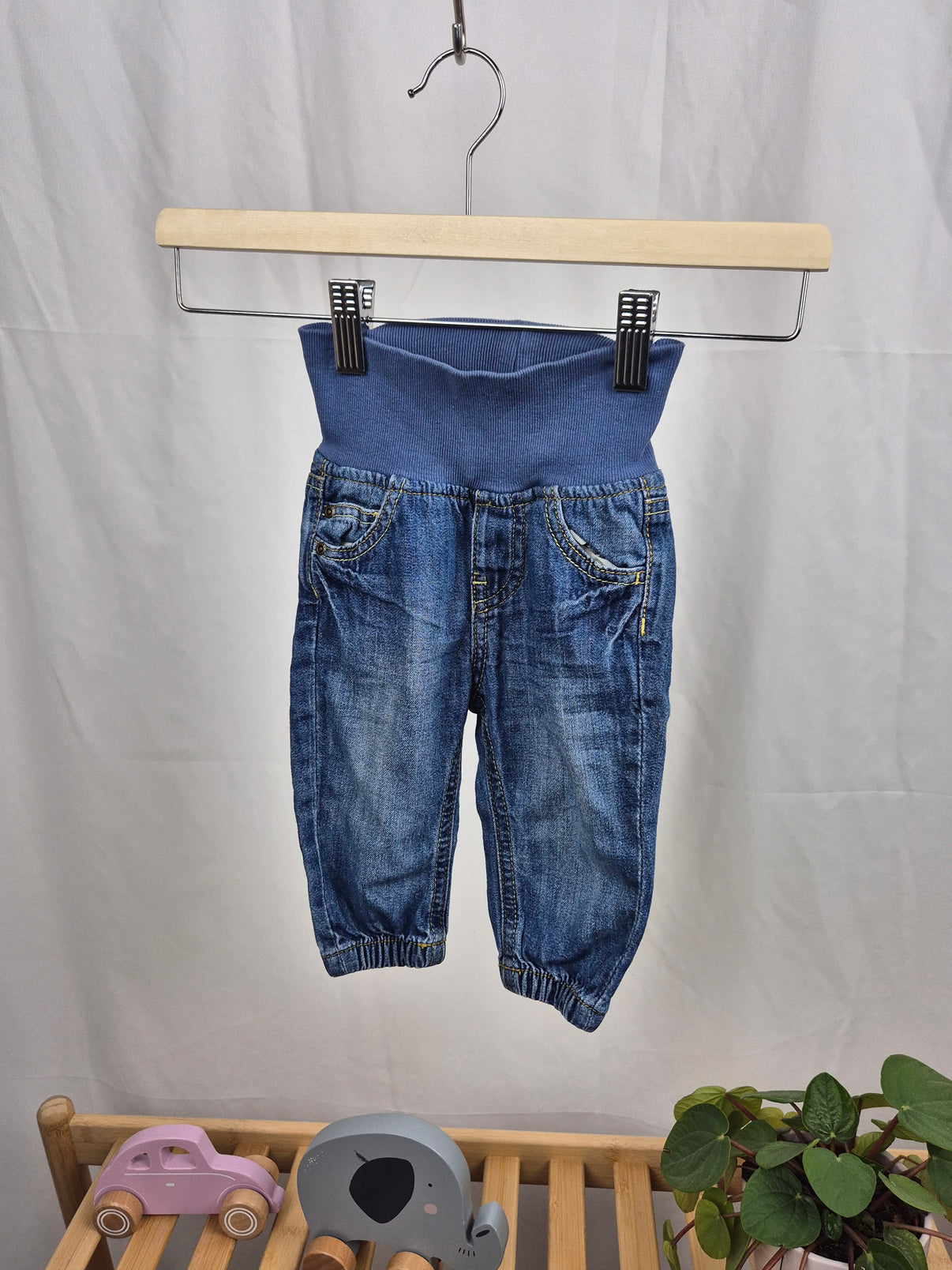 Pohodlné dětské džíny od značky H&M ve velikosti 68 s elastickým pasem v tmavě modré barvě, který zajišťuje maximální komfort při nošení a snadné oblékání. Měkký a pružný denim umožňuje volný pohyb a přizpůsobí se dětskému tělíčku. Stylový opraný efekt dodává džínám moderní vzhled. Praktické kapsy na přední i zadní straně doplňují klasický design. Díky pružným manžetám na nohavicích dobře drží a nevyhrnují se. Ideální volba pro malé kluky i holčičky na každodenní nošení.