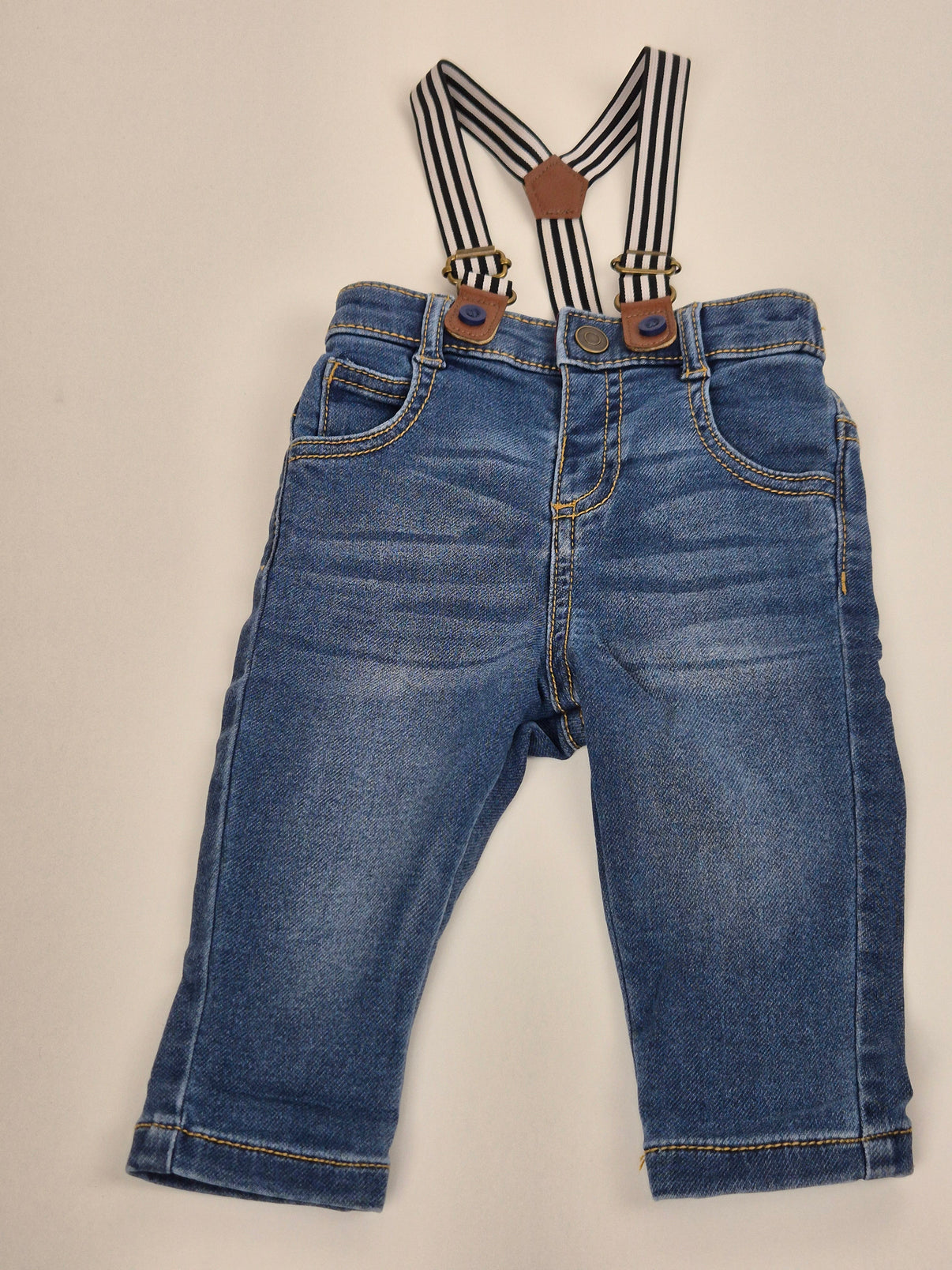 Stylové modré džíny F&F ve velikosti 68 doplněné o odnímatelné pruhované kšandy s koženkovými detaily. Praktické kapsy, zapínání na knoflík a poutka na pásek dělají z tohoto kousku nejen trendy doplněk, ale i pohodlné kalhoty pro každodenní nošení. Ideální volba pro malého elegána.