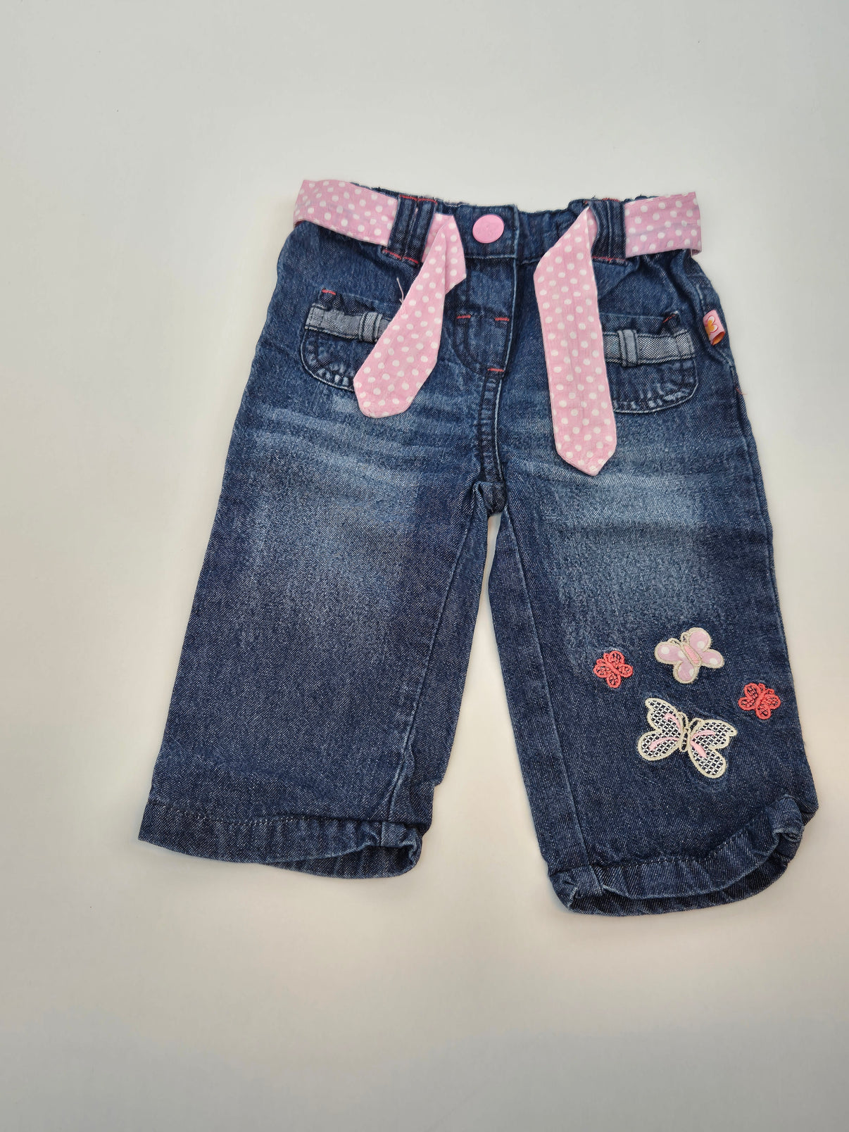 Stylové dětské džíny od značky Ergee vynikají nejen svým pohodlným střihem, ale i roztomilými detaily. Jsou ozdobené výšivkami motýlků a kytiček v jemných růžových tónech, které krásně ladí s puntíkovaným růžovým páskem a knoflíkem. Měkký dením je příjemný na nošení a díky elastickému pasu se dobře přizpůsobí dětskému bříšku. Ideální kousek pro malé holčičky na běžné nošení – do školky, na výlety i oslavy.