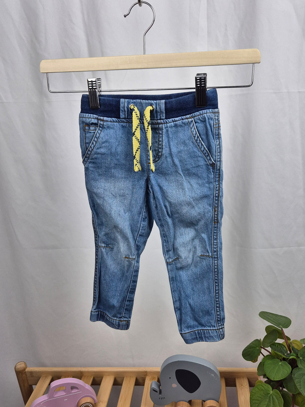Pohodlné dětské džíny od značky Coccodrillo v světle modrém denimu s mírným opraným efektem. Elastický pas s kontrastním modrým lemem a žlutou šňůrkou na stažení zajišťuje maximální pohodlí a snadné oblékání. Praktické kapsy vpředu i vzadu dodávají džínům klasický vzhled. Skvělý kousek na každodenní nošení i volnočasové aktivity. Velikost 92, ideální pro malé dobrodruhy.