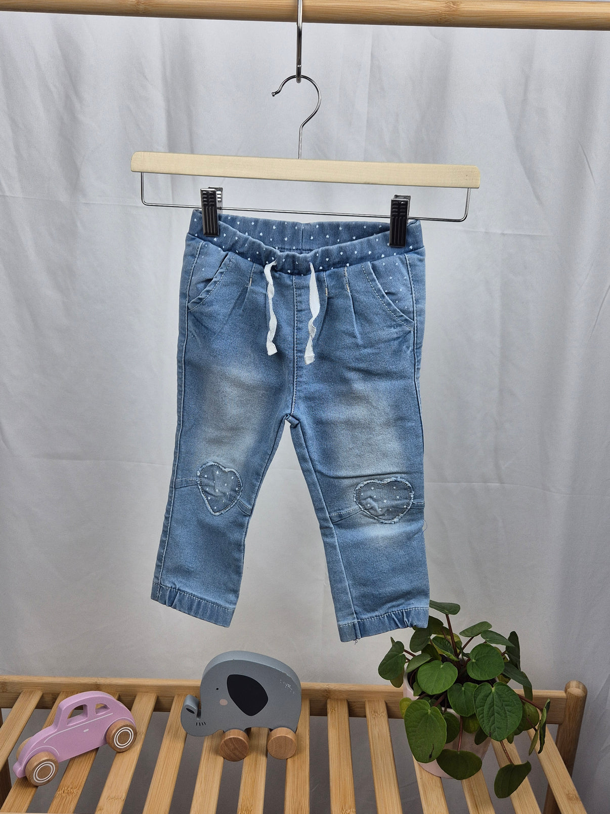 Dívčí džíny s pružným pasem od značky Pepco jsou ideální volbou pro pohodlné nošení a stylový vzhled. Džínovina s jemným vyšisovaným efektem dodává kalhotám moderní vzhled, zatímco měkký elastický pas s puntíkovaným vzorem a šňůrkou zajišťuje maximální komfort a přizpůsobení postavě. Roztomilé nášivky ve tvaru srdíček na kolenou dodávají kalhotám hravý a něžný vzhled. Praktické kapsy na přední i zadní straně umožňují ukládání drobností. Skvěle se hodí k tričku i mikině na každodenní nošení do školky či na procházky.