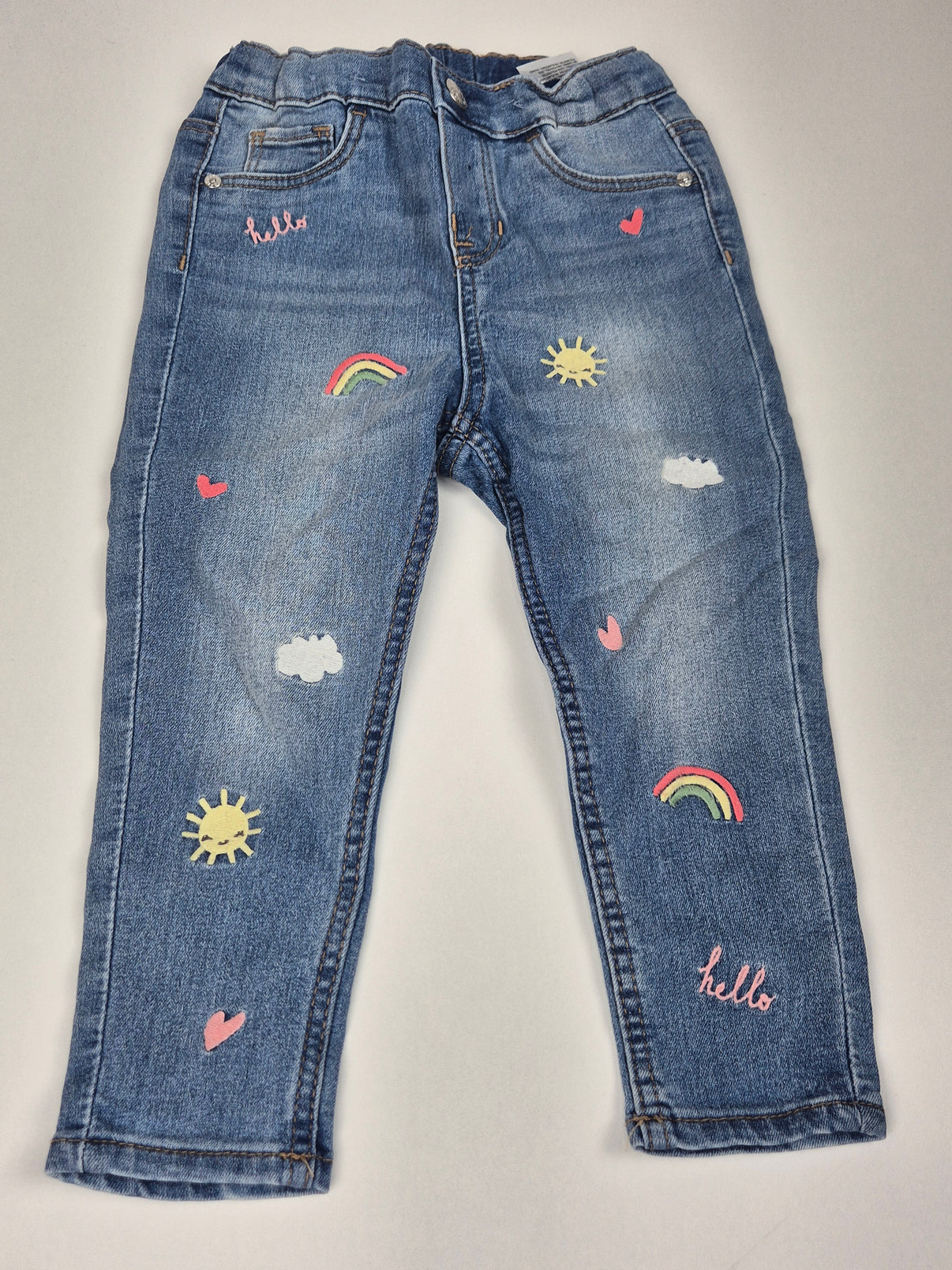 Stylové džíny od značky H&M ve velikosti 92 rozzáří každý den díky hravým výšivkám s motivy srdíček, sluníček, duhy, obláčků a nápisů „hello“. Středně modrý denim s lehce opraným efektem...