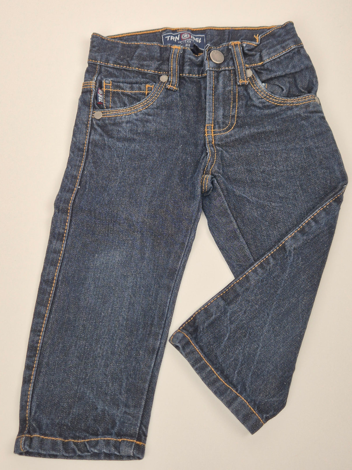 Klasické dětské džíny značky Terranova ve velikosti 86/92 v tmavě modré barvě s kontrastním oranžovým prošitím. Mají tradiční střih s poutky na pásek, zapínáním na knoflík a praktickými kapsami vpředu...