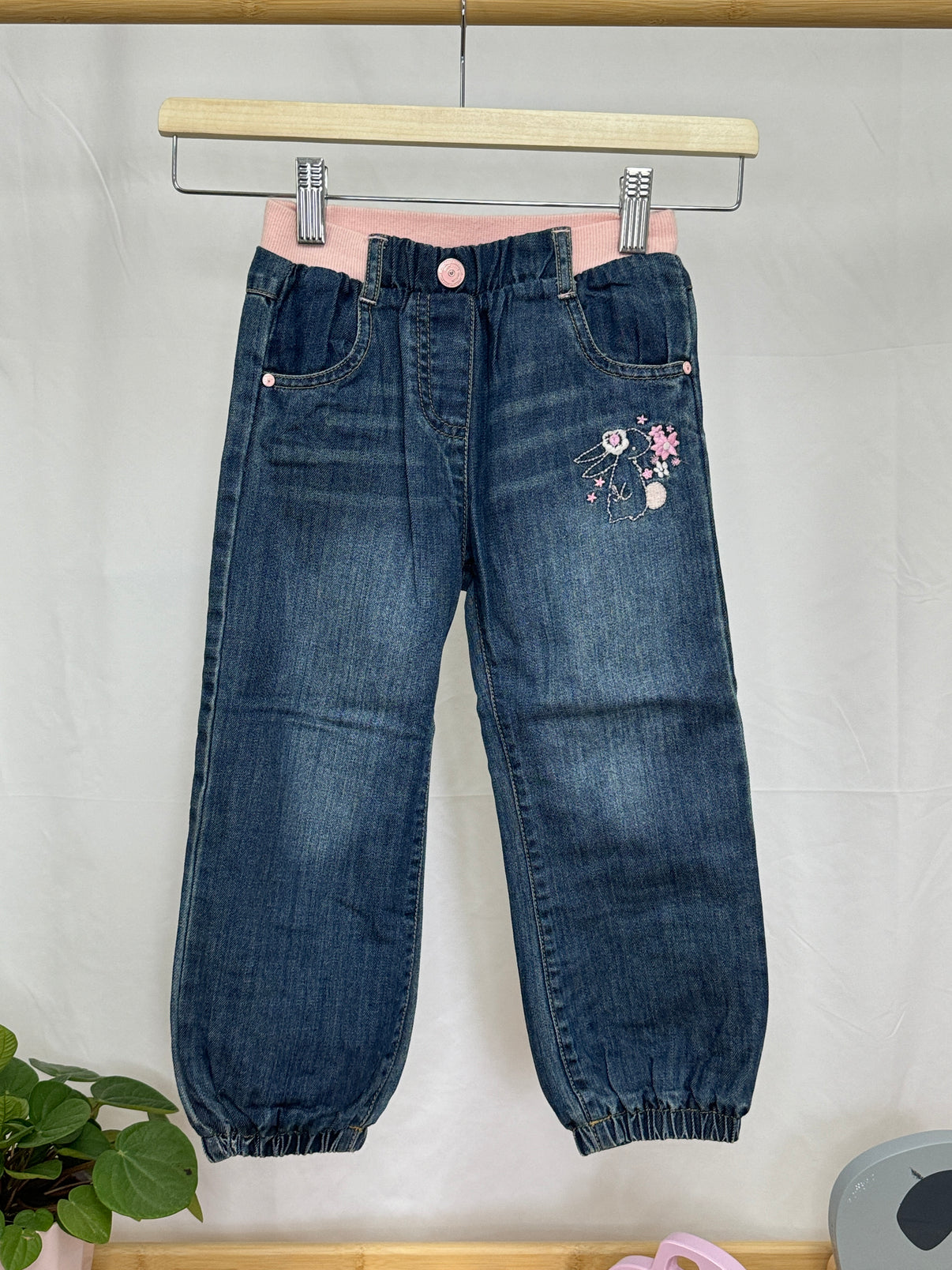 Dívčí zateplené džíny od značky Mothercare ve velikosti 98 jsou skvělou volbou do chladnějšího počasí. Džíny mají měkkou fleecovou podšívku, která udržuje dítě v teple. Elastický pas a manžety na nohavicích zajišťují pohodlné nošení, zatímco růžový detail v pase a roztomilá výšivka králíčka dodávají kalhotám hravý vzhled. Ideální pro každodenní nošení i venkovní aktivity, které malým slečnám zajistí styl a komfort během chladných dnů.