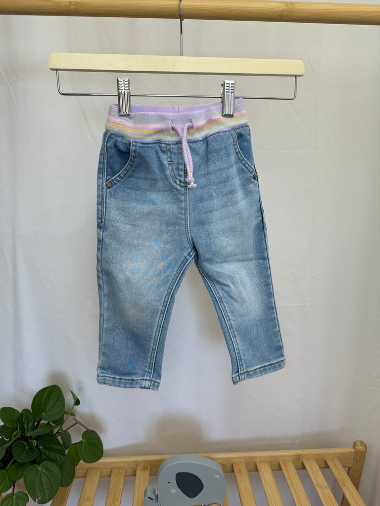 Elastické džíny Next ve velikosti 80 jsou ideální volbou pro pohodlné nošení každý den. Mají jemně opraný vzhled a pas s pružnou, pastelově pruhovanou manžetou, která se pohodlně přizpůsobí. Tyto džíny jsou nejen praktické, ale i stylové díky roztomilým zadním kapsám.