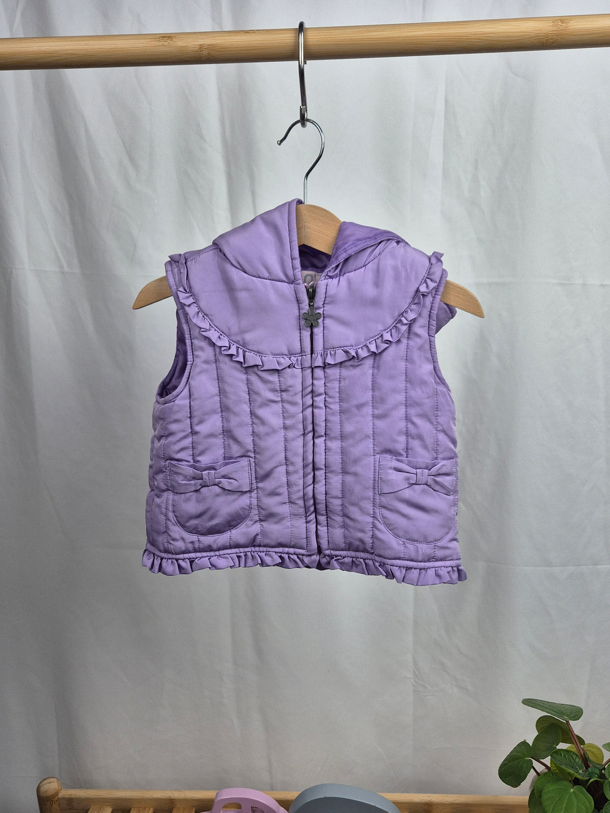 Roztomilá fialová vesta pro malé parádnice! 💜 Tato lehce zateplená vesta s jemným prošíváním je skvělou volbou do chladnějších dnů. Má roztomilé volánky, dvě kapsy s mašličkami a praktický zip s květinovým přívěskem pro snadné zapínání. Perfektní doplněk pro pohodlný a stylový outfit malé princezny. ✨💜