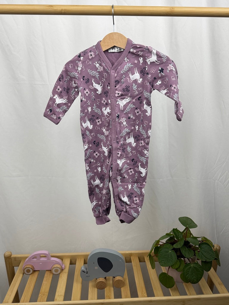Roztomilý dětský overal v jemném fialovém odstínu s veselým potiskem bílých jednorožců a květin. Celopropínací zapínání usnadní rychlé oblékání a přebalování. Dlouhé rukávy a nohavičky s manžetami zajistí teplo a pohodlí během celého dne i noci. Ideální pro malé holčičky na spaní nebo jako příjemný domácí kousek. Pohodlný materiál je jako stvořený pro bezstarostné chvíle.
