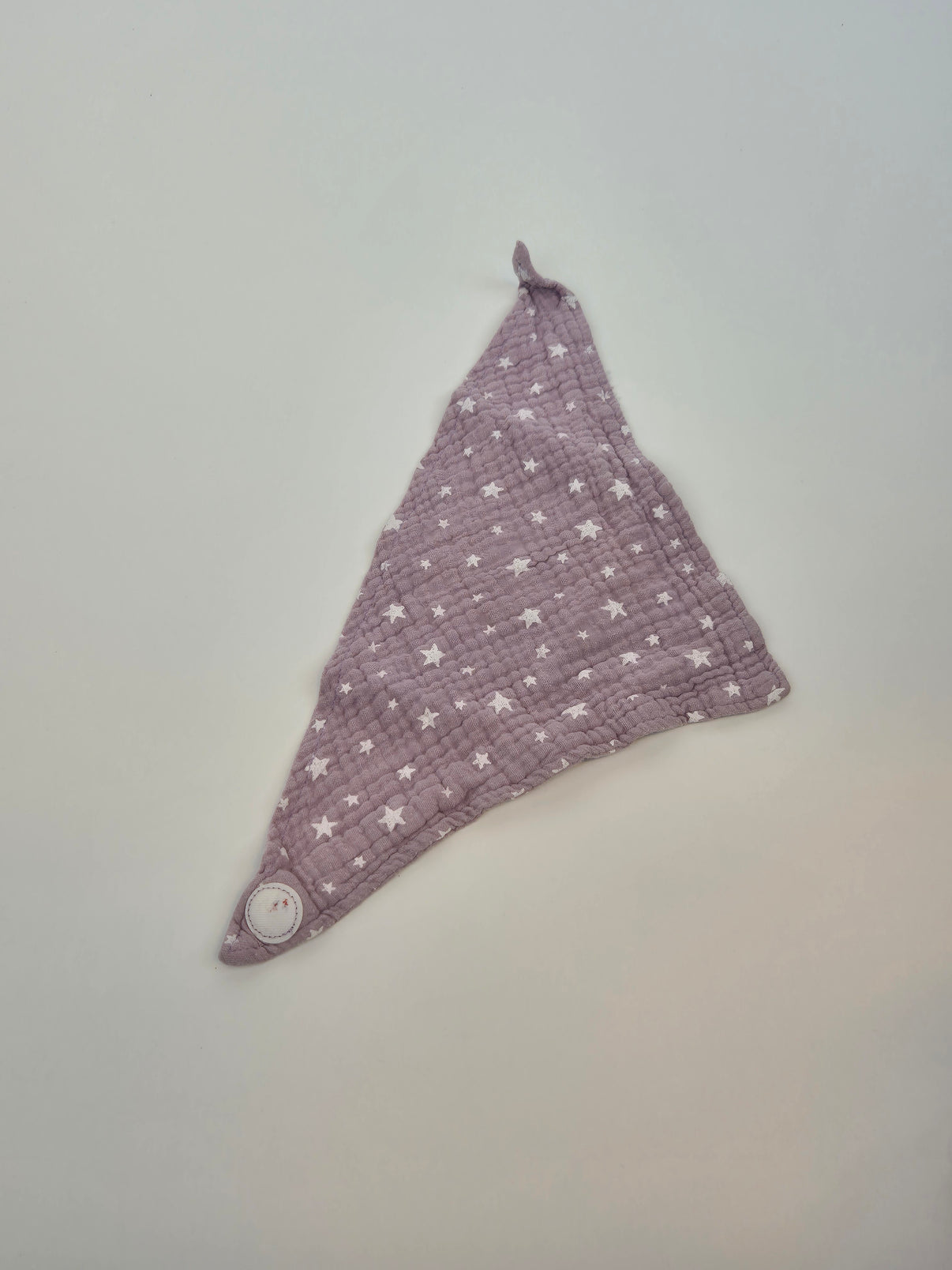 Praktický a stylový fialový slintáček s bílými hvězdičkami je skvělým doplňkem pro každé miminko – holčičku i chlapečka. Vyrobený z měkoučkého mušelínu, který je šetrný k dětské pokožce a zároveň skvěle saje. Zapínání na suchý zip usnadňuje oblékání i svlékání. Hodí se na doma, na procházky i jako módní detail k outfitu.