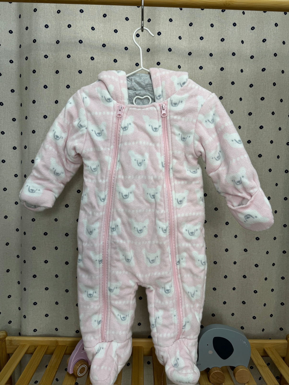 Roztomilý fleecový overal značky Marks & Spencer pro věk 9-12 měsíců je ideální volbou pro chladnější dny. Overal je v jemné růžové barvě s motivem medvídků, což mu dodává hravý a přitom něžný vzhled. Dvojité zipy vpředu usnadňují oblékání a svlékání, zatímco kapuce poskytuje extra ochranu před chladem. Měkký a teplý fleece zajistí, že vaše miminko bude v teple a pohodlí po celý den. Ideální pro venkovní procházky nebo na cestování v kočárku během zimních měsíců. Skvělý kousek do šatníku každého miminka.