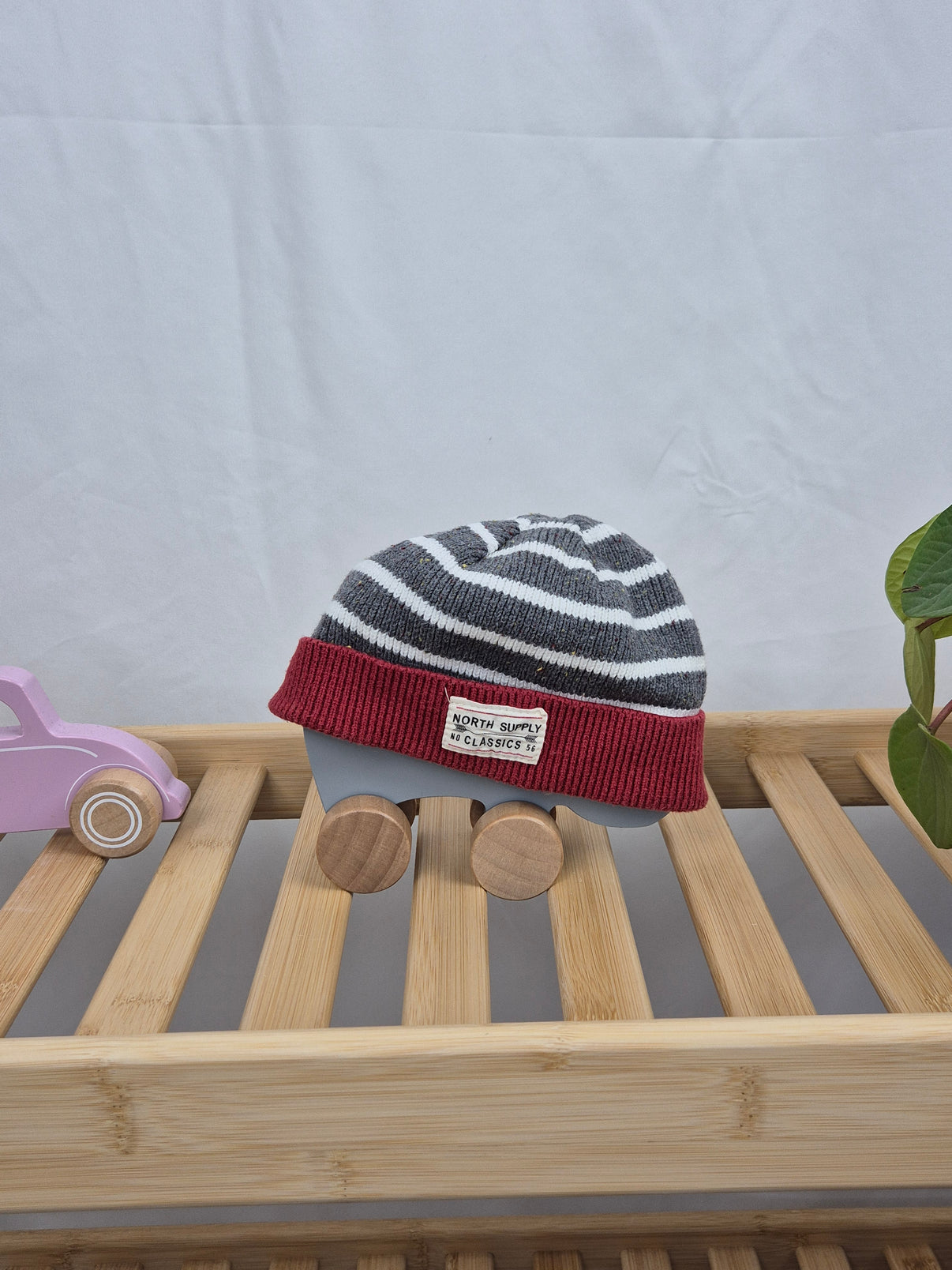 Stylová pruhovaná čepička od značky H&M, vhodná pro miminka ve věku 2–6 měsíců. Kombinace tmavě šedých a bílých pruhů je doplněna kontrastním červeným lemem, který dodává čepičce moderní vzhled. Na přední straně je dekorativní štítek „North Supply Classics“. Vyrobena z měkkého a hřejivého materiálu, ideální na chladnější dny. Skvělý doplněk pro chlapečky, který nejen zahřeje, ale i skvěle doplní outfit.