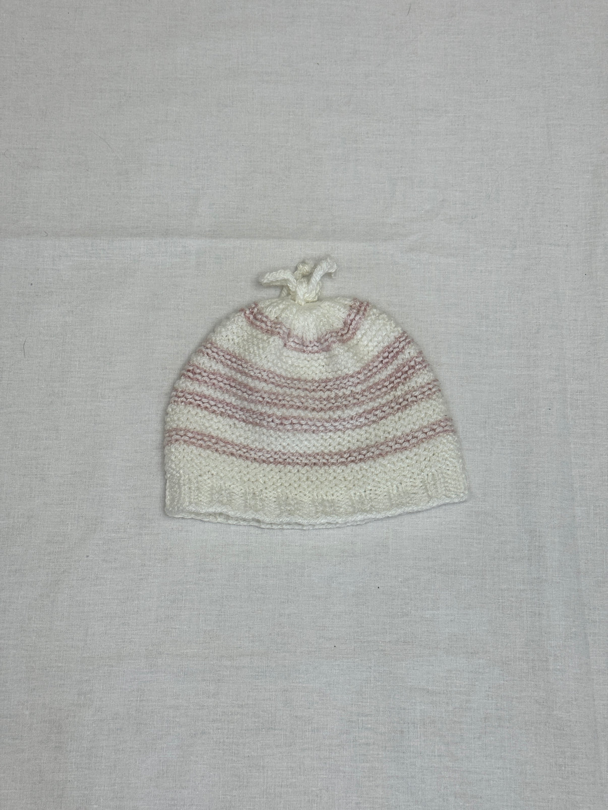 Roztomilá háčkovaná čepička pro holčičku ve velikosti 56, ideální pro novorozence. Čepička je vyrobena z jemné příze v krémové barvě s růžovými pruhy, což jí dodává jemný a sladký vzhled. Na vrcholu čepičky je malý uzlík, který jí dodává na roztomilosti. Tato čepička je skvělou volbou pro chladnější dny, kdy poskytne potřebné teplo a zároveň bude vypadat stylově. Perfektní pro první měsíce života vaší holčičky.