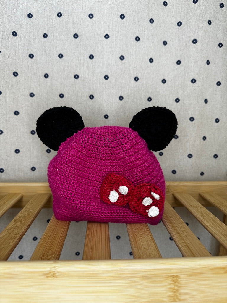Roztomilá tenčí háčkovaná čepice v sytě růžové barvě, ideální pro holčičky kolem 12 měsíců. Čepice je zdobená černými ušima a malou červenou mašličkou s bílými tečkami, což jí dodává hravý a jedinečný vzhled. Tento stylový doplněk je nejen krásný, ale i praktický, poskytující ochranu před chladnějším počasím. Perfektní volba pro jarní a podzimní dny, která oživí jakýkoli outfit vaší malé princezny. Kvalitní ruční práce zaručuje pohodlí a dlouhou životnost tohoto kousku.