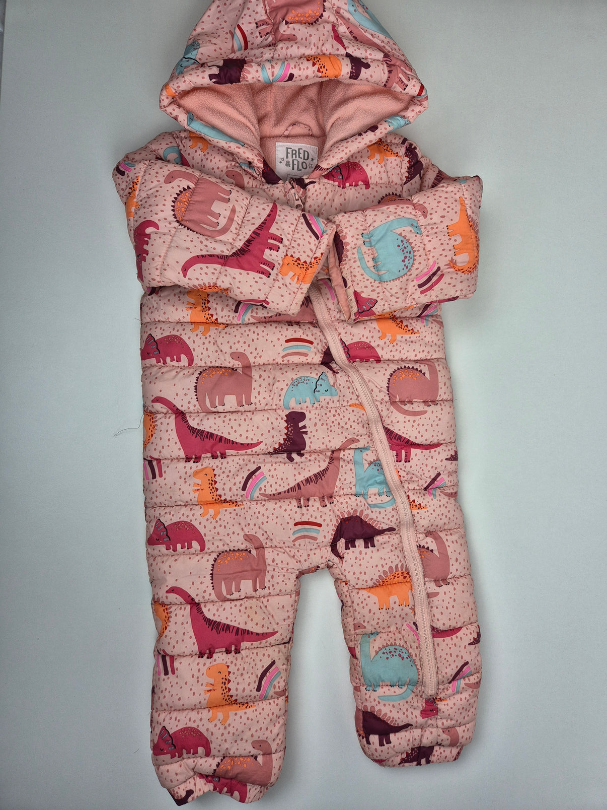 Hřejivá zimní kombinéza F&F v něžném starorůžovém odstínu s celoplošným hravým potiskem dinosaurů v pastelových barvách. Kombinace růžové, tyrkysové, vínové a oranžové působí veselým, dětským dojmem a krásně rozzáří zimní outfit.