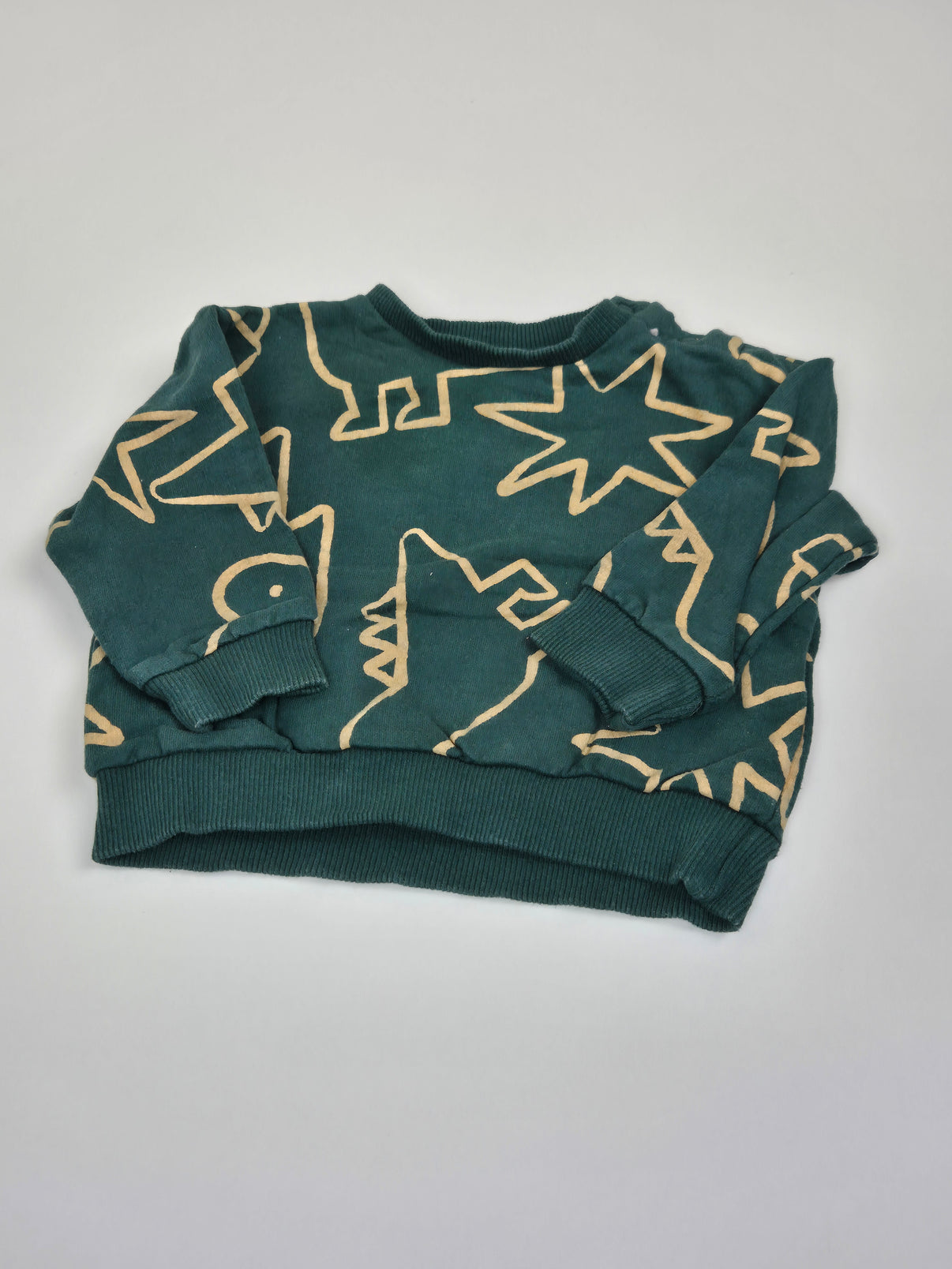 Měkká a pohodlná mikina Sinsay v krásném tmavě zeleném odstínu, ozdobená hravým potiskem dinosaurů v kontrastní béžové barvě. Žebrované lemy na rukávech i spodním okraji pomáhají udržet tvar a příjemná teplákovina je ideální na každodenní nošení – do kočárku, na doma i na výlety. Skvělý kousek především pro chlapečka, ale potěší i malou milovnici dinosaurů.