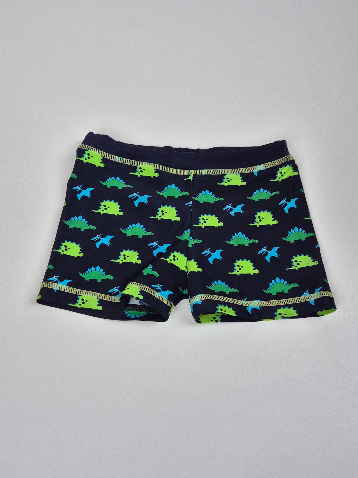 Plavky značky Topomini, velikost 98, mají tmavě modrý základ s veselým potiskem zelených a modrých dinosaurů. Pohodlný střih ve stylu boxerek zaručí, že se budou skvěle hodit na letní dovádění...