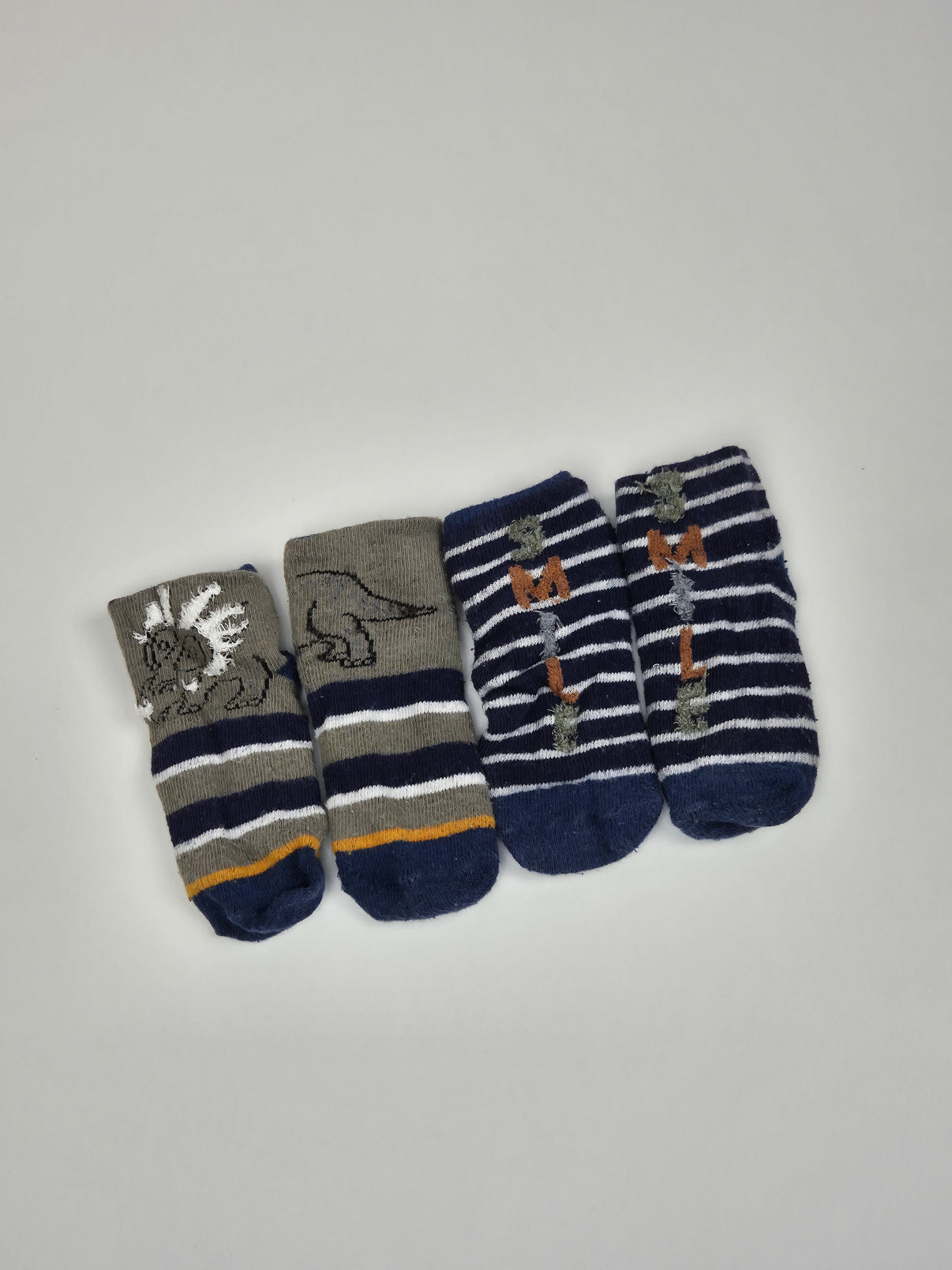 Sada 2 párů měkkých dětských ponožek ve velikosti 68, ideální na běžné denní nošení i do kočárku. Oba páry mají příjemný žebrovaný úplet a hravé motivy – první v kombinaci šedé a námořnické modré s dinosaury, druhý námořnický s pruhy a drobnými obrázky.
