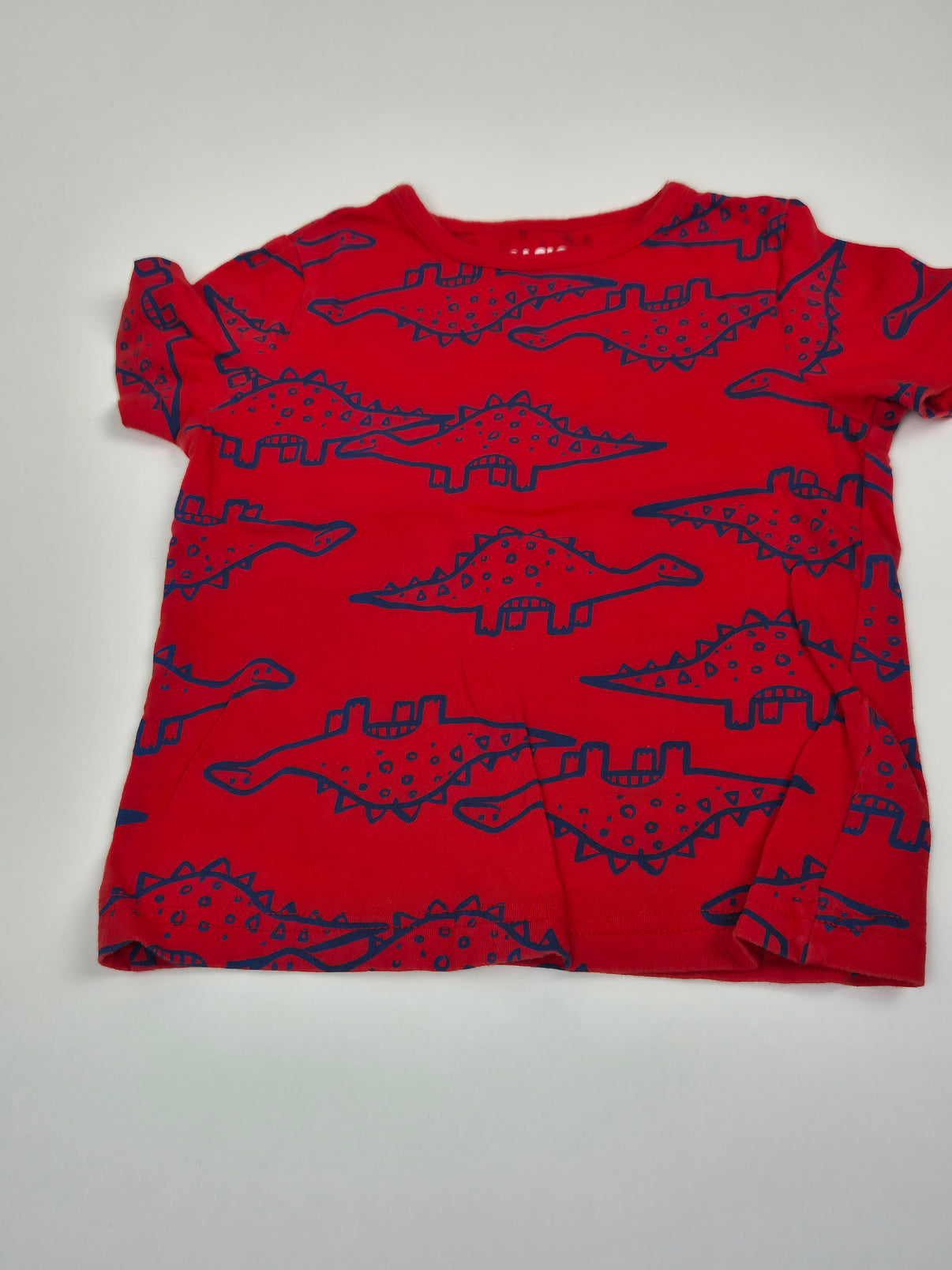 Veselé dětské tričko v sytě červené barvě s hravým potiskem modrých dinosaurů po celé ploše. Příjemný bavlněný materiál je ideální na každodenní nošení – do školky, na hřiště i na doma. Univerzální střih je skvělý především pro kluky, ale díky motivu si ho může oblíbit i odvážná dinosauří slečna. Značka F&F.
