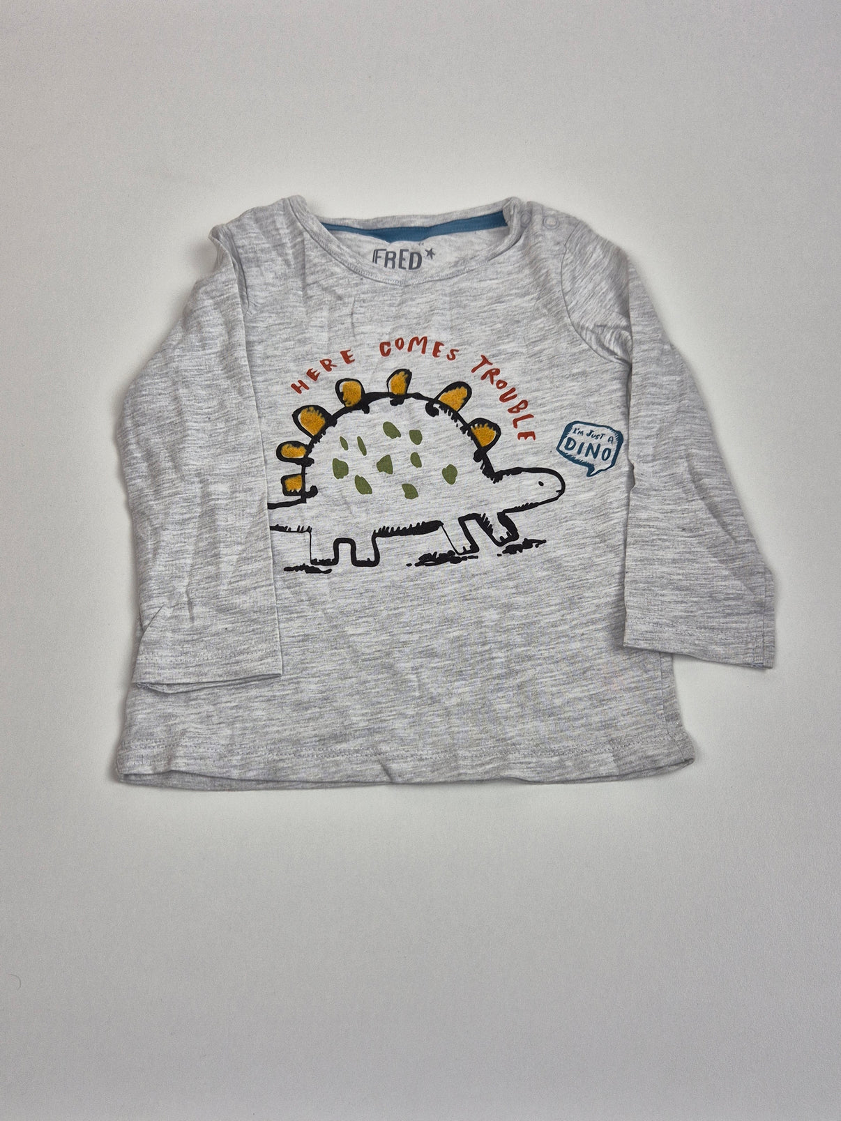 Světle šedé melírované tričko s dlouhým rukávem zaujme hravým dinosaurím motivem a veselým potiskem na přední straně. Jemný odstín šedé krásně vyniká s barevnými detaily dinosaura a hodí se ke každodennímu nošení – do školky, na hřiště i na výlety. Díky příjemnému materiálu je tričko pohodlné a vhodné na vrstvení během chladnějších dnů. Kousek je ideální spíš pro kluka, ale udělá radost i malému milovníkovi dinosaurů bez ohledu na pohlaví.