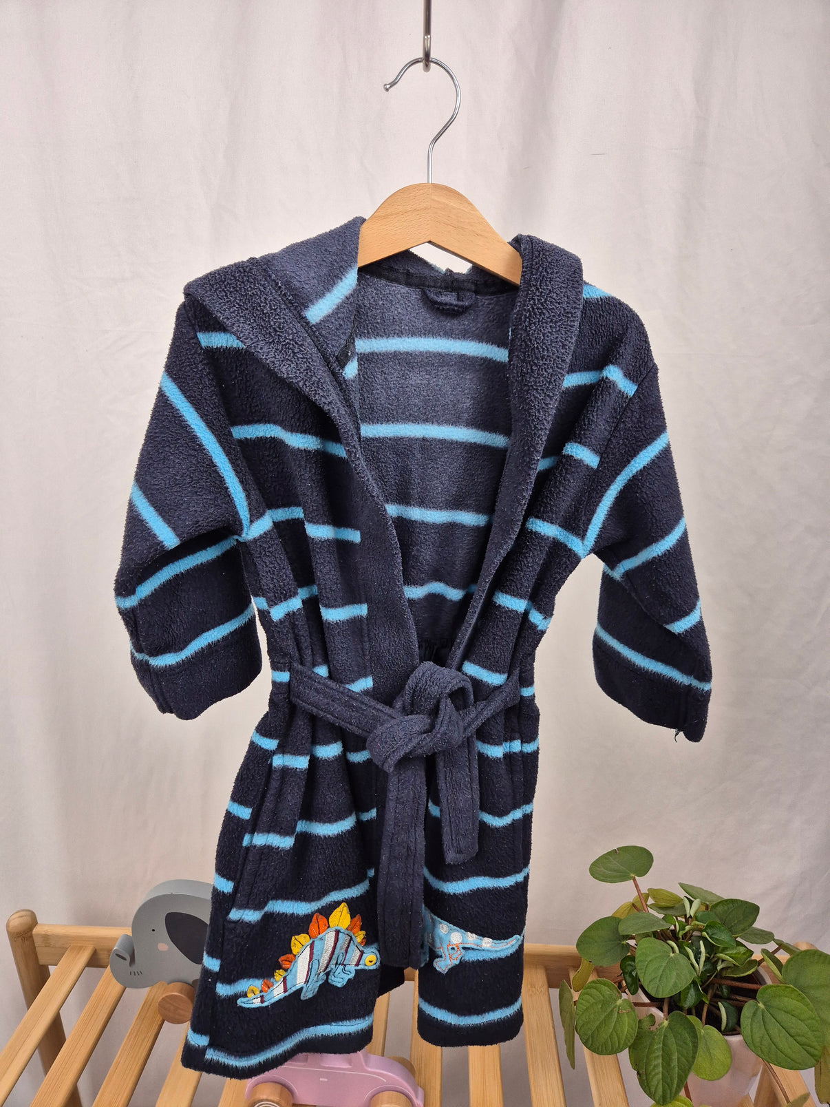 Heboučký dětský župan od značky Marks & Spencer v tmavě modré barvě s tyrkysovými pruhy je ideální na zahřátí po koupeli nebo lenošení doma. Kapuce přidává na pohodlí a praktický pásek v pase zajistí, že župan dobře drží. Veselé výšivky dinosaurů na spodním lemu potěší každého malého milovníka pravěkých tvorů. Skvělá volba pro kluky, kteří si rádi hrají i po koupání – stylový a funkční kousek v jednom.