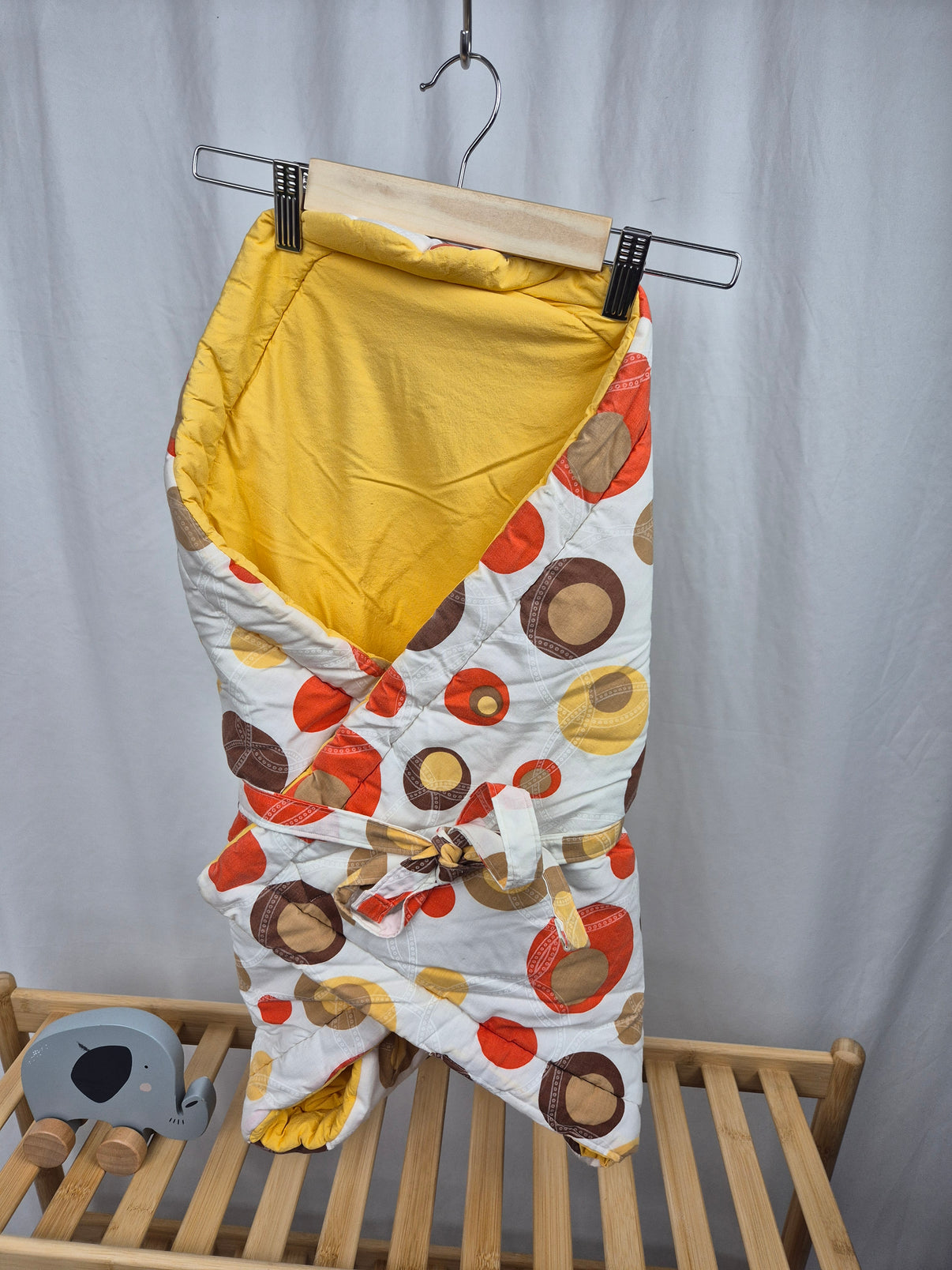 Měkká a pohodlná zavinovačka v barevném vzoru s oranžovými, hnědými a žlutými kruhy, uvnitř s příjemnou žlutou podšívkou. Praktické zavazování zajistí, že miminko bude mít pocit bezpečí a pohodlí. Vhodná do postýlky i do kočárku.